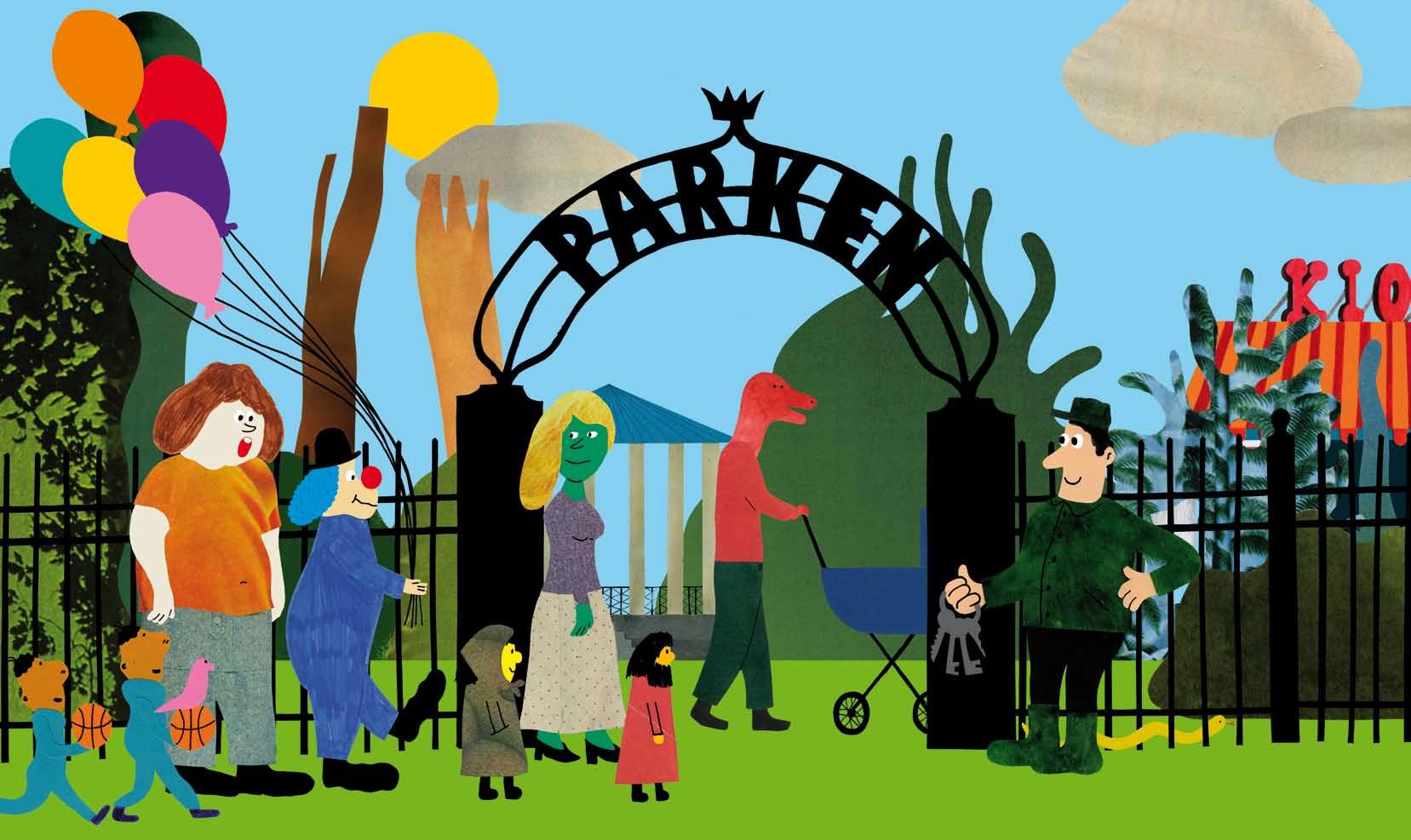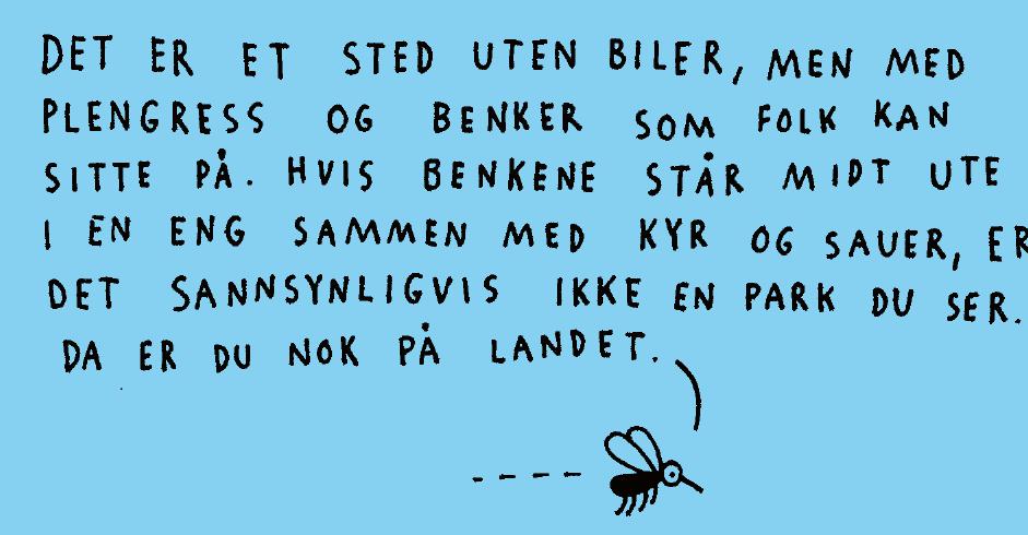 Av og til trenger både barn og voksne en pause fra fornuftige og hverdagslige gjøremål. Da kan det være fint å ha en park i nærheten hvor man kan leke, slappe av og la tankene vandre. I parken vår er det plengress og benker folk kan sitte på når de filosoferer. I parken er det mange vesener - små og store dyr, fargerike fugler, en burugle og noen drager. Det er også en litt nifs parkvakt der, og busker man kan gjemme seg bak. I parken er det en dam med en øde øy. Der sitter det en gammel mann sammen med skilpadden sin, de elsker poesi og sitronbrus. Dette er en bildebok som kombinerer humor, filosofi og barnlig anarki i et lekent formspråk.