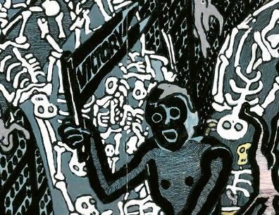 Amongst the conglomeration of figures in the war scenes in Jobkill, we can detect a man waterskiing on a canal filled with corpses, blood and death. He is waving a banner that says “Victory”. Can we imagine a more fitting metaphor for industrialism’s annihilation of the environment or the weapon industry’s many macabre victories? Or a more terrifying glimpse into the future? Does this not echo the victory speech that George W. Bush made on 1 May, 2003, when as Commander-in-Chief of the world’s largest military power, he stood on the deck of the warship USS Abraham Lincoln in the Persian Gulf and declared that the war on Iraq had been won? On the enormous banner behind the president was a slogan that said: “Mission Accomplished”. Perhaps it is not at all strange that the prize-winning war reporter Mark Danner called the Iraq War “The War of the Imagination”.33 Here fantasy confronts fantasy: Mr Push versus Mr Soft. Fantasy and reality merge into one another.