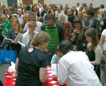 køen av signatursankende bokkjøpere et par hundre meter lang. Forbausende mange var unge mennesker som kunne vært hans barnebarn. Når vi tar i betraktning at det ikke er mer enn ti år siden han var uteligger og holdt liv i seg ved hjelp av illegalt dop, og folk helst unnvek ham, da forstår vi hvorfor kunstneren måtte ta en piruett mellom annenhver signering. Suksessen er overveldende.14