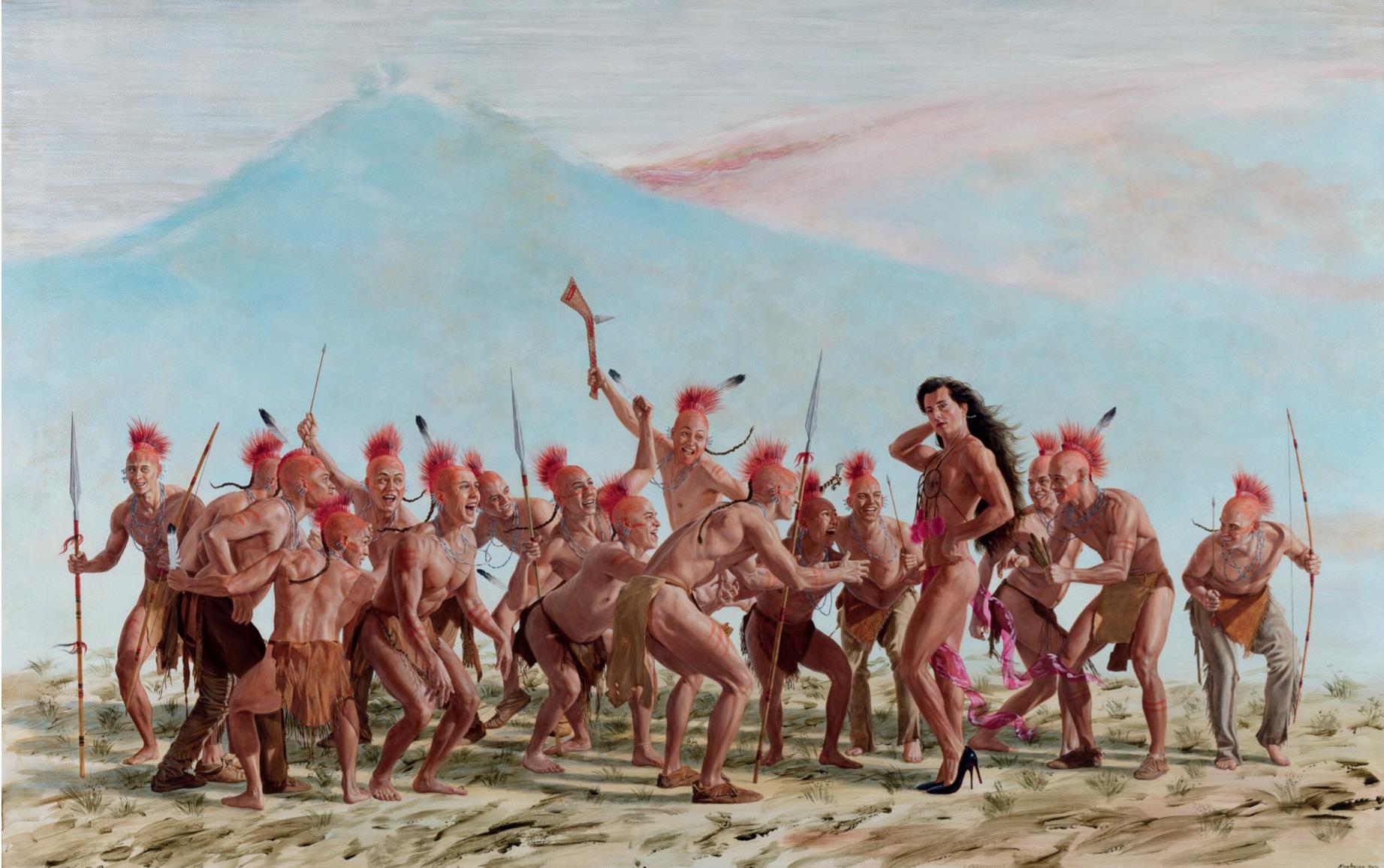 2000, Monkman s’intéresse davantage aux peintres romantiques du XIXe siècle, tels que Thomas Cole et George Catlin, qui racontaient l’histoire coloniale à travers des représentations idéalisées des nations autochtones dans des paysages grandioses encore inexplorés. Le contenu de ces œuvres crée un véritable tournant dans son style artistique. À partir de ce moment-là, Monkman s’attaque de plein fouet à la manière dont l’histoire a été racontée. Les peintures du XIXe siècle donnent une vision unilatérale de l’histoire : celle des conquérants. Monkman s’approprie les codes et les techniques de la peinture romantique pour représenter, cette fois, la colonisation du point de vue autochtone. En déconstruisant la narrative coloniale qui faisait des premiers peuples des victimes, il inverse la dynamique de pouvoir : les colons deviennent à leur tour objets du désir et de la satire, dans des mises en scène ironiques, souvent marquées par l’homosexualité. Parmi ses premières œuvres de ce type — Ceci n’est pas une pipe et Daniel Boone’s First View of the Kentucky Valley (2001) —, Monkman met en scène des rapports sexuels entre un Autochtone et un colon. Les corps y sont représentés sans détour, les parties génitales exposées, afin d’accentuer le caractère provocateur de la scène.