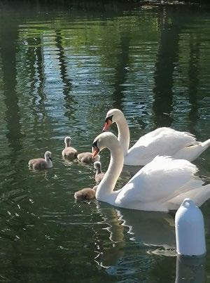 Eine 12.000 m² große Grünfläche, natürlich beschattete Bereiche, eine Wasserrutsche und ein Sprungbrett für Badespaß.