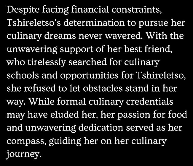 Dive into the inspiring journey of Tshireletso Jasson as she shares her passion for cooking and her determination to turn her culinary dreams into reality
