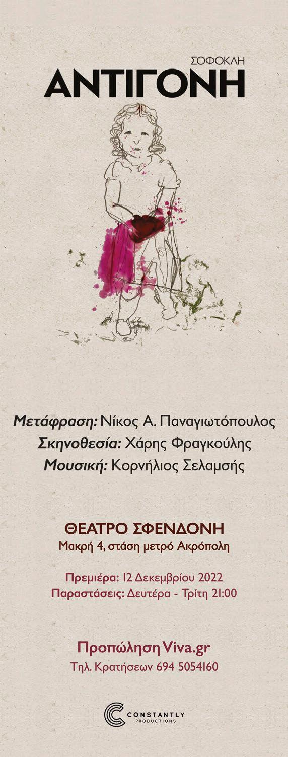 Αντώνη Αντωνίου. Από 8/12, Θεατρική Σκηνή, Νάξου 84, πλατεία Κολιάτσου, Τετ. 19:30, Πέμ.-Σάβ. 21:00, Κυρ. 20:00, είσοδος: 10-15 ευρώ