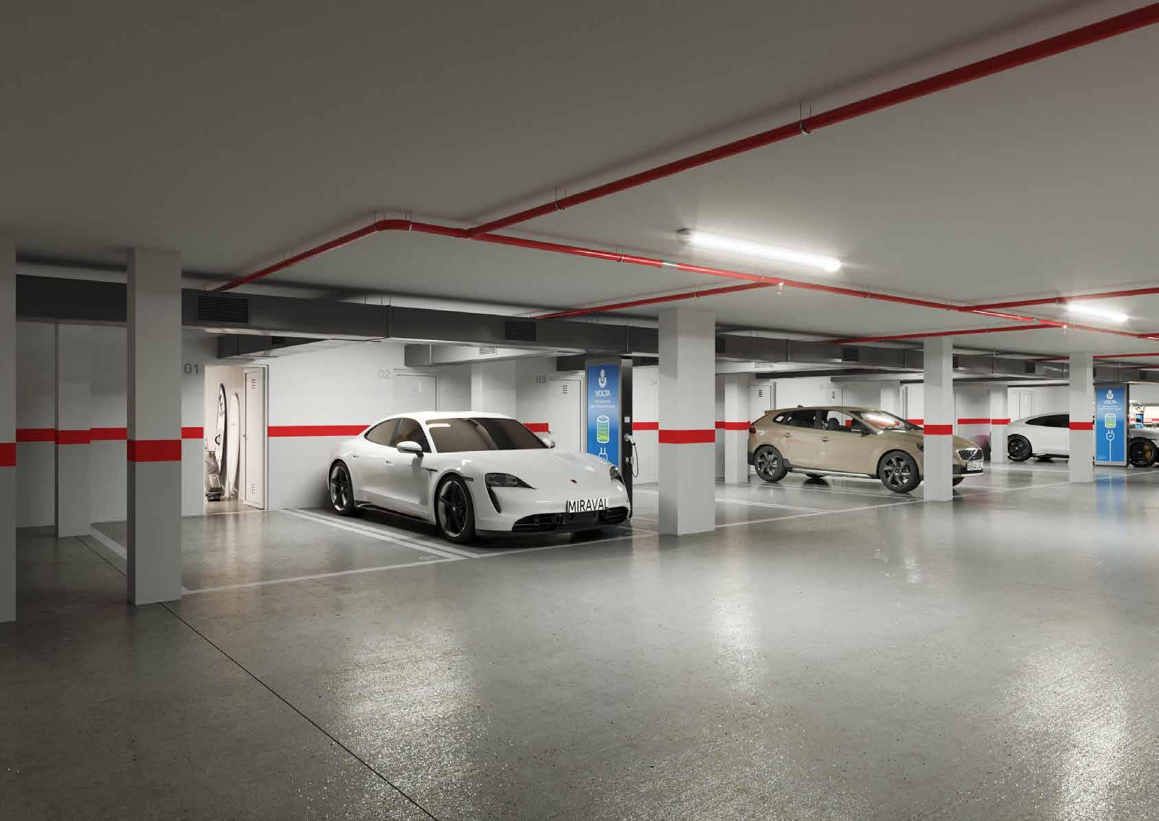 • Las plazas de aparcamiento cuentan 12,5 m2 y tienen trastero privado junto a cada plaza de aparcamiento, con enchufe e iluminación.