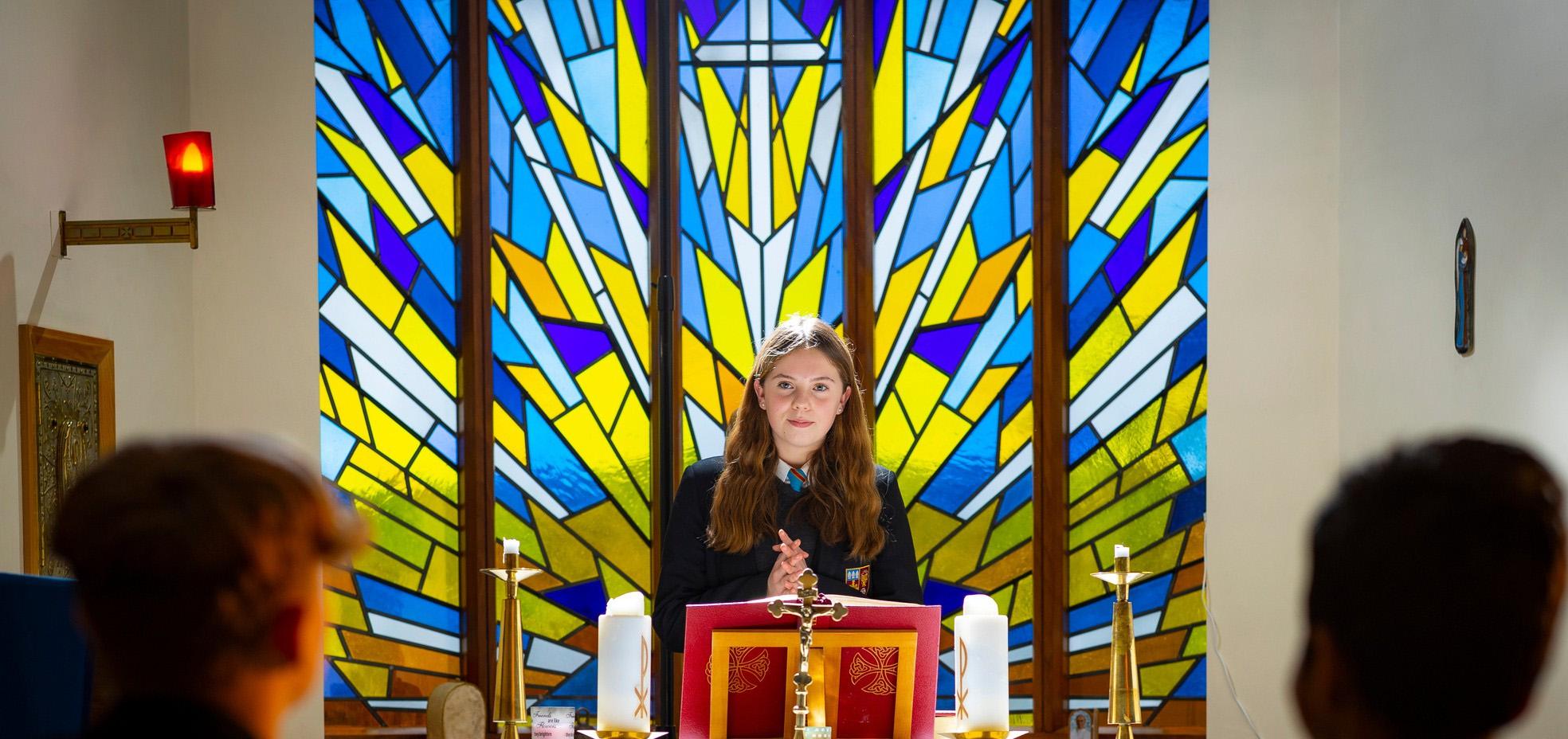 Wearea Catholicschoolforall faiths,and everybodyis welcometo befully involvedinourCatholiccommunity.Eachweek,pupilsgathertogetherfor collectiveworship.Thisisplannedandledbypupilsandstaff.Massandservices eachtermandreflectivedailyprayerarealso keyfeaturesofthedistinctive Catholic natureofourschool.AllarewelcomeinourChapelfor quietreflectionat breakorlunchandthisiswherethechaplaincyteammeetweekly.