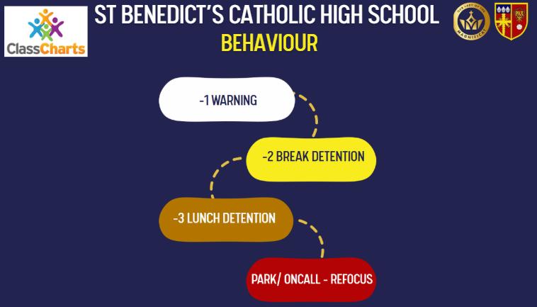 PunctualityisimportantatStBenedict’sCatholicHighSchool.Thelaw requiresyoutoensurepupilsareinschoolontime.Registrationstartsat 8.55am,sopupilsshouldbeontheschoolgroundsby8.50am.Ifthey arrivelate,theywillbegivenalatemarkanda15-minutebreaktime detention.Twoor morelatemarksinoneweek willresultin aone-hour detention onaFridayafterschool.