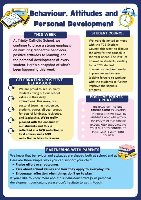 Our students have shone brightly across every area of school life academics, sports, creative arts, and leadership From the inspiring work of the Big Sister Project to the many stewardship and chaplaincy opportunities, our young people consistently demonstrate kindness, responsibility, and maturity It has been wonderful to award numerous Headteacher Badges to students who have gone above and beyond. Their enthusiastic involvement in extracurricular activities from sporting fixtures and art projects to community and faith events speaks volumes about their dedication