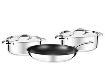 Gryteserie i rustfritt kvalitetsstål, med lokk i herdet sikkerhetsglass. Kjelene kommer med en praktisk helletut og lokkene med sil, slik at du enkelt kan helle kokevannet av potetene uten søl. Ekstra tykke bunner sørger for optimal varmefordeling.