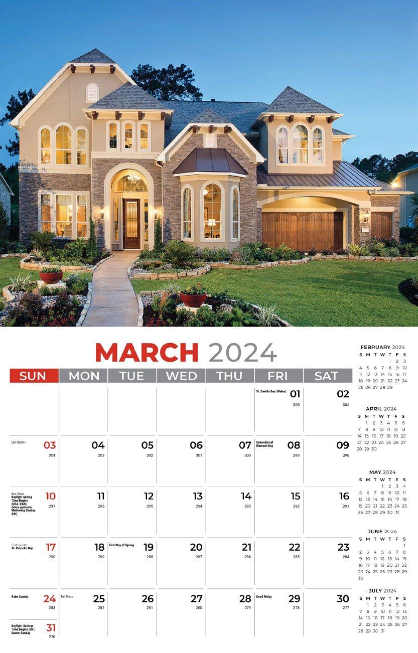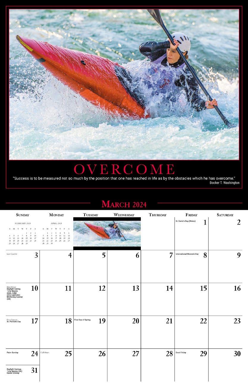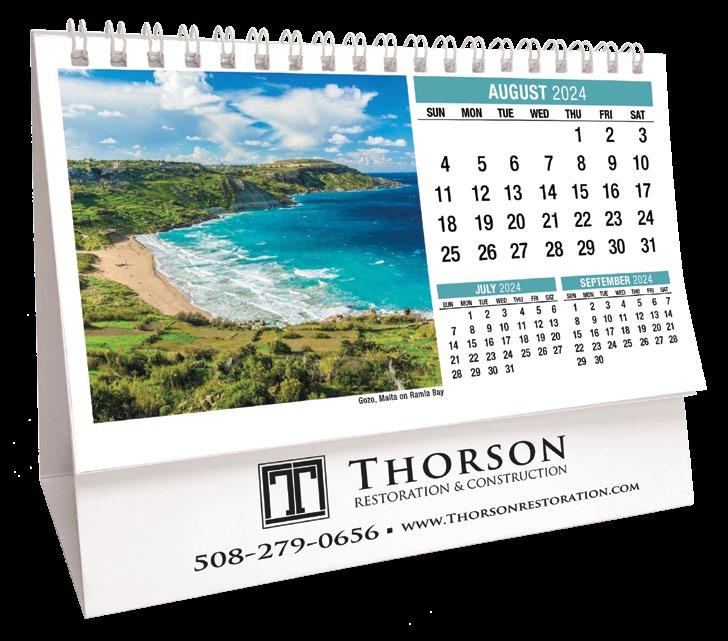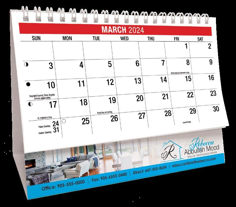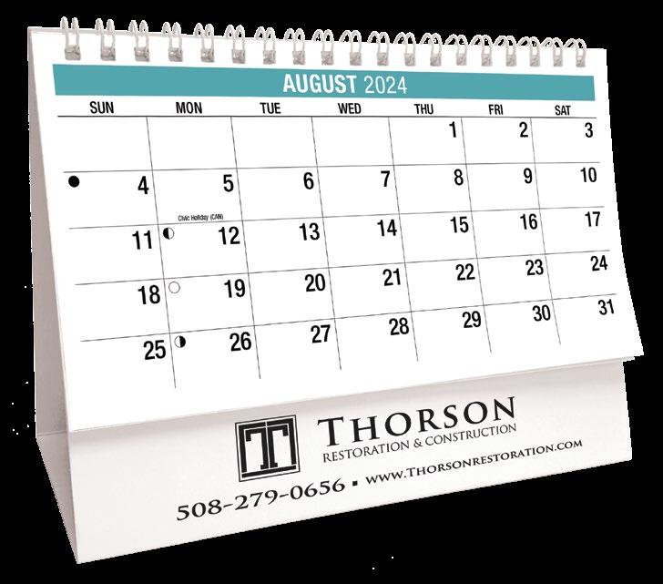 INCLUDED IN PRICE OF CALENDAR YOUR CHOICE OF 4 STANDARD COLOURS IMPRINT STANDARD ONE COLOUR BLACK REFLEX BLUE RED (185) GREEN (342) • 1 Colour Set-up – $35 (c) Imprint Area 1¼” x 10” • Full Colour Set-up - $35 (c) Imprint Area 1¼” x 10” Imprint Area 1⅝” x 10 ⅞” (bleed on bottom & sides) • Open Size 10 ⅝” x 18 ½” • Closed Size 10 ⅝” x 10” • Weight 22 lbs. per 100. Mix & Match Titles Minimum 50/Title www.GalleriaCalendars.com MATRIX TIRE CENTRE 1237 DUNWOODY AVENUE, DULUTH, GEORGIA 770-555-9854 20 MOTIVATION 2024-0056 YOUR COMPANY’S NAME PERSONAL MESSAGE SPACE! 123 ADDRESS, YOUR TOWN/CITY, ST 12345 (PH) 555.555.5555 • EMAIL@ADDRESS.COM • WWW.YOURWEBSITE.COM