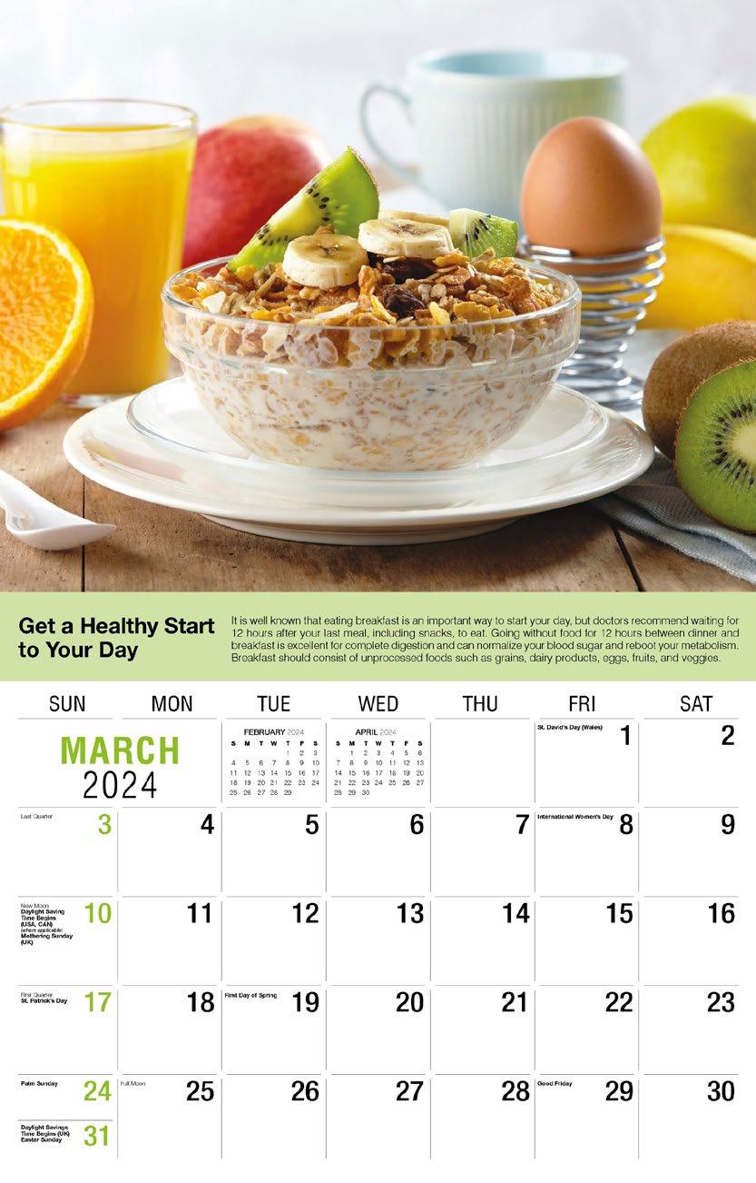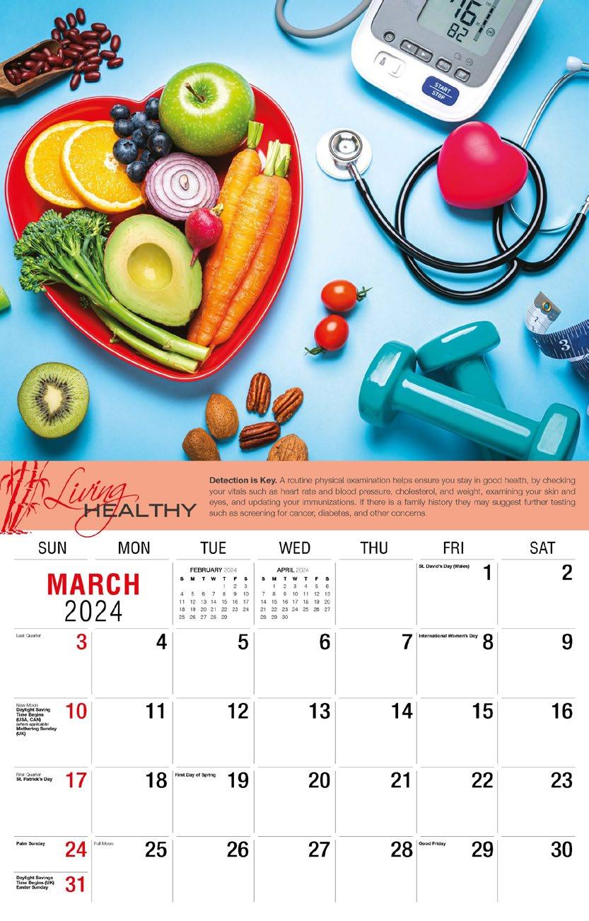 INCLUDED IN PRICE OF CALENDAR YOUR CHOICE OF 4 STANDARD COLOURS IMPRINT STANDARD ONE COLOUR BLACK REFLEX BLUE RED (185) GREEN (342) • 1 Colour Set-up – $35 (c) Imprint Area 1¼” x 10” • Full Colour Set-up - $35 (c) Imprint Area 1¼” x 10” Imprint Area 1⅝” x 10 ⅞” (bleed on bottom & sides) • Open Size 10 ⅝” x 18 ½” • Closed Size 10 ⅝” x 10” • Weight 22 lbs. per 100. Mix & Match Titles Minimum 50/Title www.GalleriaCalendars.com MATRIX TIRE CENTRE 1237 DUNWOODY AVENUE, DULUTH, GEORGIA 770-555-9854 46 YOUR COMPANY’S NAME PERSONAL MESSAGE SPACE! 123 ADDRESS, YOUR TOWN/CITY, ST 12345 (PH) 555.555.5555 • EMAIL@ADDRESS.COM • WWW.YOURWEBSITE.COM HEALTH TIPS 2024-0053