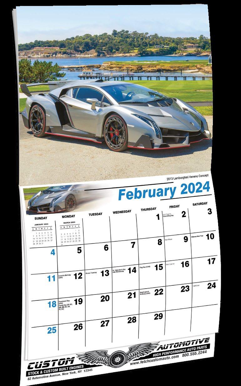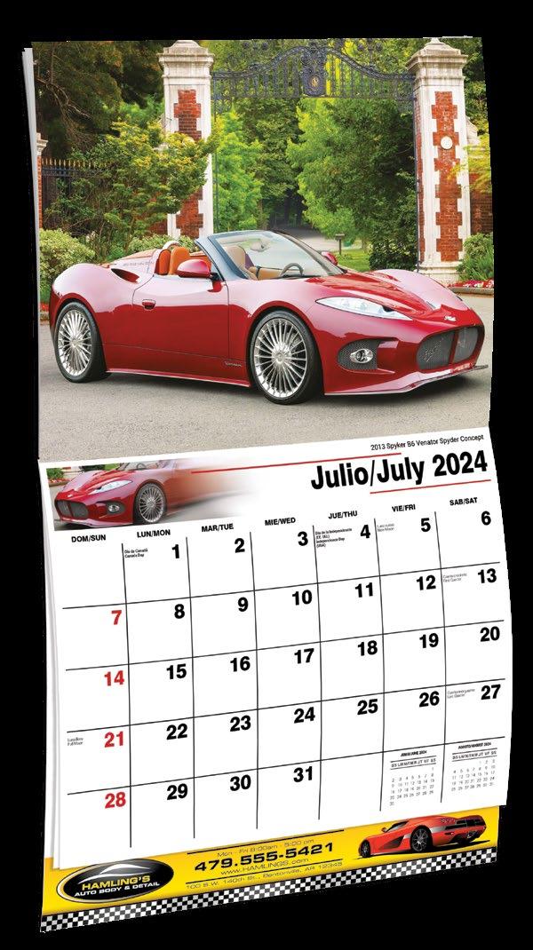INCLUDED IN PRICE OF CALENDAR YOUR CHOICE OF 4 STANDARD COLOURS IMPRINT STANDARD ONE COLOUR BLACK REFLEX BLUE RED (185) GREEN (342) • 1 Colour Set-up – $35 (c) Imprint Area 1¼” x 10” • Full Colour Set-up - $35 (c) Imprint Area 1¼” x 10” Imprint Area 1⅝” x 10 ⅞” (bleed on bottom & sides) • Open Size 10 ⅝” x 18 ½” • Closed Size 10 ⅝” x 10” • Weight 22 lbs. per 100. Mix & Match Titles Minimum 50/Title www.GalleriaCalendars.com MATRIX TIRE CENTRE 1237 DUNWOODY AVENUE, DULUTH, GEORGIA 770-555-9854 38 YOUR COMPANY’S NAME PERSONAL MESSAGE SPACE! 123 ADDRESS, YOUR TOWN/CITY, ST 12345 (PH) 555.555.5555 • EMAIL@ADDRESS.COM • WWW.YOURWEBSITE.COM EXOTIC CARS 2024-0050 2024-0224 Bilingual