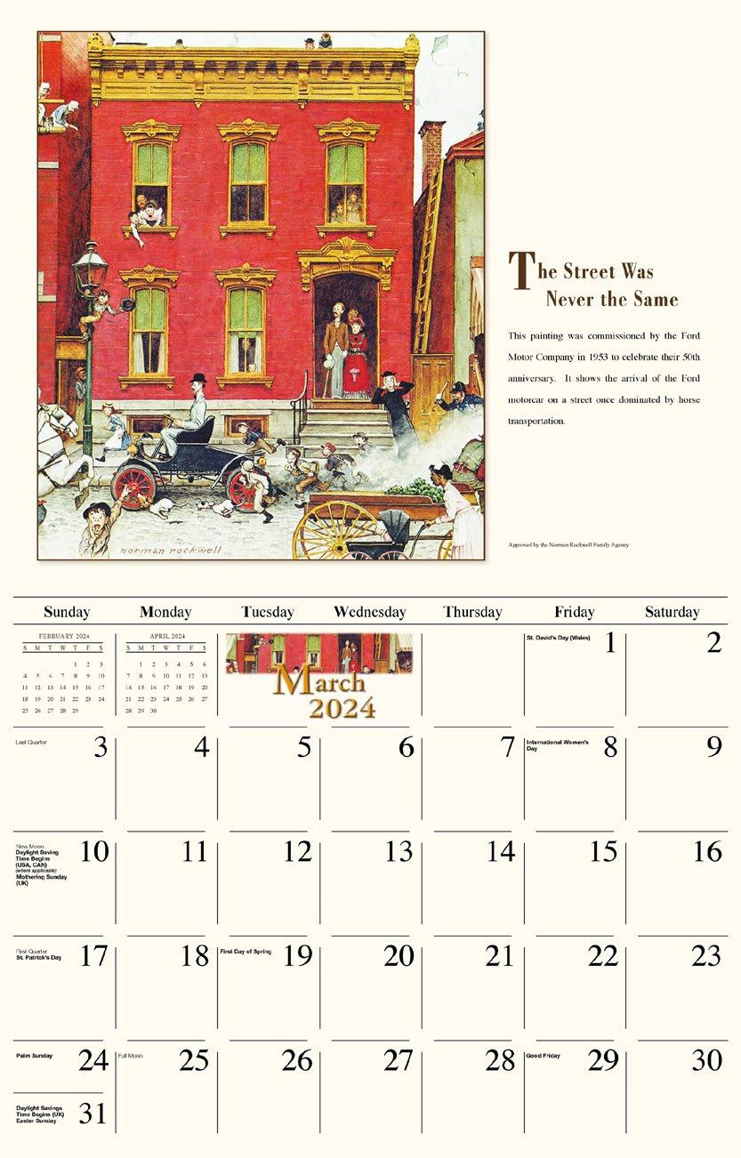 INCLUDED IN PRICE OF CALENDAR YOUR CHOICE OF 4 STANDARD COLOURS IMPRINT STANDARD ONE COLOUR BLACK REFLEX BLUE RED (185) GREEN (342) • 1 Colour Set-up – $35 (c) Imprint Area 1¼” x 10” • Full Colour Set-up - $35 (c) Imprint Area 1¼” x 10” Imprint Area 1⅝” x 10 ⅞” (bleed on bottom & sides) • Open Size 10 ⅝” x 18 ½” • Closed Size 10 ⅝” x 10” • Weight 22 lbs. per 100. Mix & Match Titles Minimum 50/Title www.GalleriaCalendars.com MATRIX TIRE CENTRE 1237 DUNWOODY AVENUE, DULUTH, GEORGIA 770-555-9854 48 YOUR COMPANY’S NAME PERSONAL MESSAGE SPACE! 123 ADDRESS, YOUR TOWN/CITY, ST 12345 (PH) 555.555.5555 • EMAIL@ADDRESS.COM • WWW.YOURWEBSITE.COM memorable images by NORMAN ROCKWELL 2024-0057