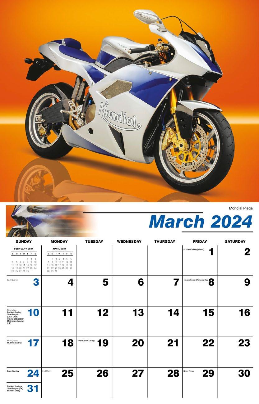 INCLUDED IN PRICE OF CALENDAR YOUR CHOICE OF 4 STANDARD COLOURS IMPRINT STANDARD ONE COLOUR BLACK REFLEX BLUE RED (185) GREEN (342) • 1 Colour Set-up – $35 (c) Imprint Area 1¼” x 10” • Full Colour Set-up - $35 (c) Imprint Area 1¼” x 10” Imprint Area 1⅝” x 10 ⅞” (bleed on bottom & sides) • Open Size 10 ⅝” x 18 ½” • Closed Size 10 ⅝” x 10” • Weight 22 lbs. per 100. Mix & Match Titles Minimum 50/Title www.GalleriaCalendars.com MATRIX TIRE CENTRE 1237 DUNWOODY AVENUE, DULUTH, GEORGIA 770-555-9854 40 YOUR COMPANY’S NAME PERSONAL MESSAGE SPACE! 123 ADDRESS, YOUR TOWN/CITY, ST 12345 (PH) 555.555.5555 • EMAIL@ADDRESS.COM • WWW.YOURWEBSITE.COM MOTORCYCLE MANIA 2024-0173