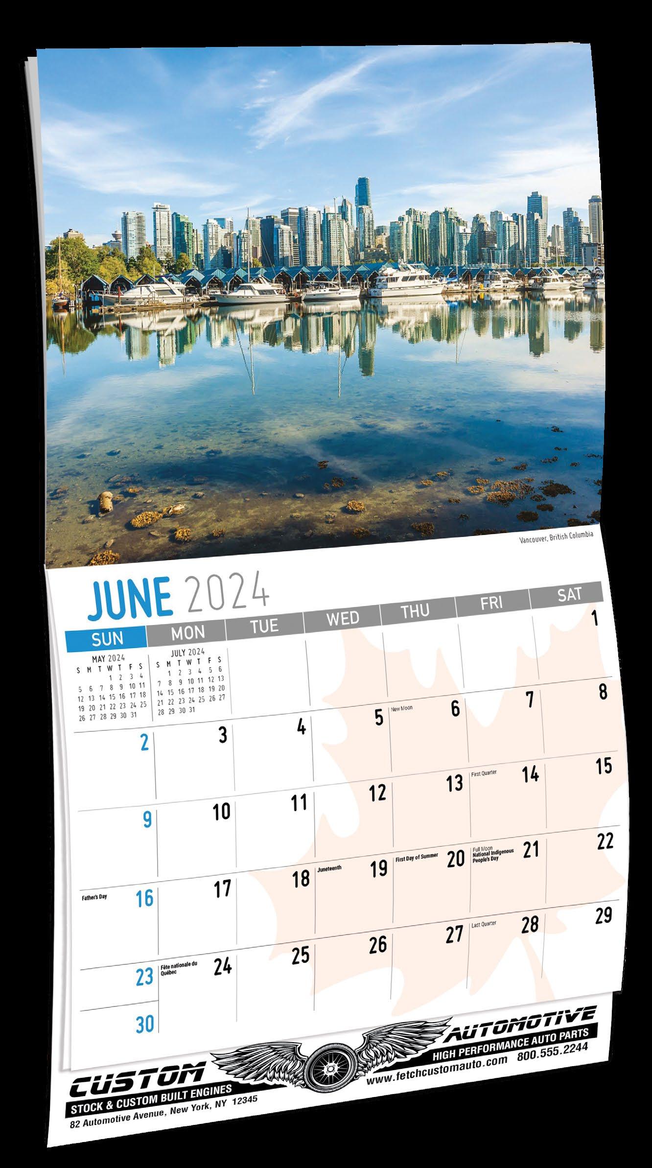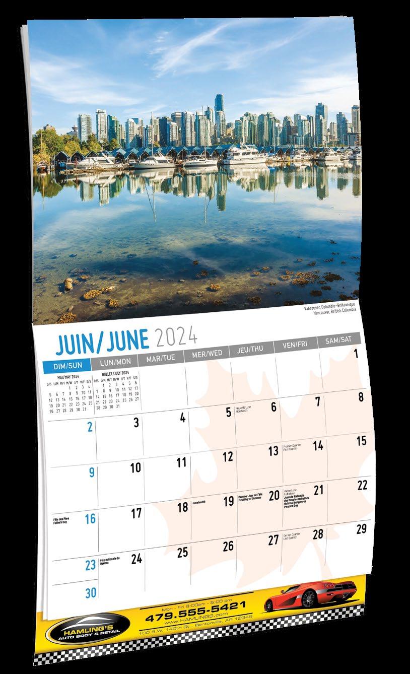INCLUDED IN PRICE OF CALENDAR YOUR CHOICE OF 4 STANDARD COLOURS IMPRINT STANDARD ONE COLOUR BLACK REFLEX BLUE RED (185) GREEN (342) • 1 Colour Set-up – $35 (c) Imprint Area 1¼” x 10” • Full Colour Set-up - $35 (c) Imprint Area 1¼” x 10” Imprint Area 1⅝” x 10 ⅞” (bleed on bottom & sides) • Open Size 10 ⅝” x 18 ½” • Closed Size 10 ⅝” x 10” • Weight 22 lbs. per 100. Mix & Match Titles Minimum 50/Title www.GalleriaCalendars.com MATRIX TIRE CENTRE 1237 DUNWOODY AVENUE, DULUTH, GEORGIA 770-555-9854 4 SCENES OF CANADA 2024-0047 Eng. 2024-0046 Bilingual YOUR COMPANY’S NAME PERSONAL MESSAGE SPACE! 123 ADDRESS, YOUR TOWN/CITY, ST 12345 (PH) 555.555.5555 • EMAIL@ADDRESS.COM • WWW.YOURWEBSITE.COM