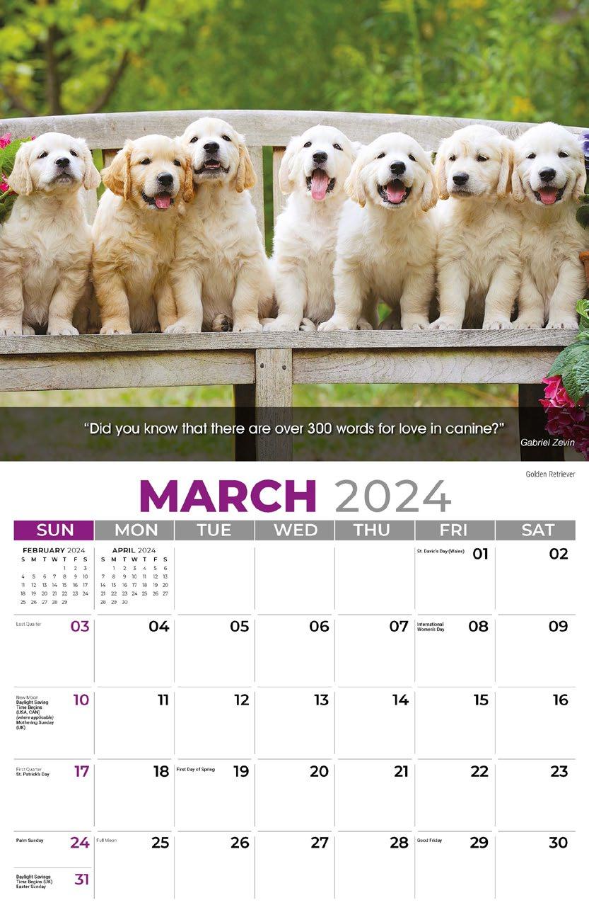 INCLUDED IN PRICE OF CALENDAR YOUR CHOICE OF 4 STANDARD COLOURS IMPRINT STANDARD ONE COLOUR BLACK REFLEX BLUE RED (185) GREEN (342) • 1 Colour Set-up – $35 (c) Imprint Area 1¼” x 10” • Full Colour Set-up - $35 (c) Imprint Area 1¼” x 10” Imprint Area 1⅝” x 10 ⅞” (bleed on bottom & sides) • Open Size 10 ⅝” x 18 ½” • Closed Size 10 ⅝” x 10” • Weight 22 lbs. per 100. Mix & Match Titles Minimum 50/Title www.GalleriaCalendars.com MATRIX TIRE CENTRE 1237 DUNWOODY AVENUE, DULUTH, GEORGIA 770-555-9854 30 YOUR COMPANY’S NAME PERSONAL MESSAGE SPACE! 123 ADDRESS, YOUR TOWN/CITY, ST 12345 (PH) 555.555.5555 • EMAIL@ADDRESS.COM • WWW.YOURWEBSITE.COM PETS 2024-0228