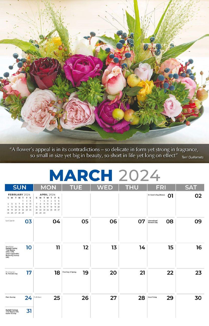 INCLUDED IN PRICE OF CALENDAR YOUR CHOICE OF 4 STANDARD COLOURS IMPRINT STANDARD ONE COLOUR BLACK REFLEX BLUE RED (185) GREEN (342) • 1 Colour Set-up – $35 (c) Imprint Area 1¼” x 10” • Full Colour Set-up - $35 (c) Imprint Area 1¼” x 10” Imprint Area 1⅝” x 10 ⅞” (bleed on bottom & sides) • Open Size 10 ⅝” x 18 ½” • Closed Size 10 ⅝” x 10” • Weight 22 lbs. per 100. Mix & Match Titles Minimum 50/Title www.GalleriaCalendars.com MATRIX TIRE CENTRE 1237 DUNWOODY AVENUE, DULUTH, GEORGIA 770-555-9854 22 YOUR COMPANY’S NAME PERSONAL MESSAGE SPACE! 123 ADDRESS, YOUR TOWN/CITY, ST 12345 (PH) 555.555.5555 • EMAIL@ADDRESS.COM • WWW.YOURWEBSITE.COM FLOWERS & GARDENS 2024-0051