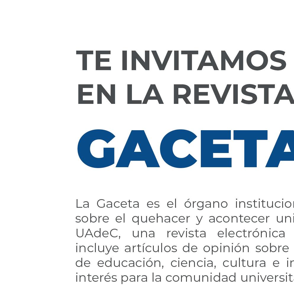 GACETA UAdeC: Es el órgano institucional de difusión sobre el quehacer y acontecer universitario de la UAdeC, una revista electrónica bimestral que incluye artículos de opinión sobre temas actuales de educación, ciencia, cultura e investigación de interés para la comunidad universitaria. Sin fines de lucro.