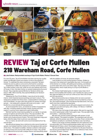 218 Wareham Road, Corfe Mullen By Luke Graham. Meal provided courtesy of Taj of Corfe Mullen. Photos © Dorset View For over 25 years, Taj of Corfe Mullen has been serving top-quality Indian and Bengali cuisine and classic curries to the people of Dorset. To celebrate this silver anniversary, proprietor Taj Islam invited me and my wife to come and try the food for ourselves. Established in 2000, the restaurant is a family-owned operation: Taj’s older brother is the chef, while his son and nephew work frontof-house. In fact, the Islam family run several restaurants all around Dorset. They originally opened Wimborne Tandoori all the way back in 1981. More recently, they opened Westbourne Tandoori last September. Stepping into Taj of Corfe Mullen, I was struck by the stylish interior, which featured several paintings and warm colours. The restaurant is divided into three areas: a raised platform looking out into Corfe Mullen, an open-plan area perfect for parties and large groups — the restaurant is popular with local curry clubs — and booths for a more intimate dining experience. As we browsed the menu, we shared an entrée of poppadoms with dips, including sweet and tasty mango chutney and mint yoghurt, a yummy onion salad and a spicy chilli pickle. We then had the mixed sharing platter for our starter, to sample a range of options served by the venue. This was excellent. The chicken and lamb tikka were cooked to perfection: succulent, tender and a lovely amount of spice. The onion bhaji was crispy and tasty, while the deep-fried mushroom was delicious. For our mains, we went with some recommendations from Taj and his team. My wife almost always has a mild korma (she cannot handle hot spices), but instead tried the modhu from the signature dish section of the menu. This tasted incredible. Chicken cooked in mild spices as well as honey and coconut with a little bit of cream. Very similar to a traditional korma but with a deeper flavour and beautifully sweet