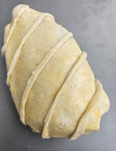 Turn the Wellington over and place it down onto a greased baking tray, then brush with a beaten egg.