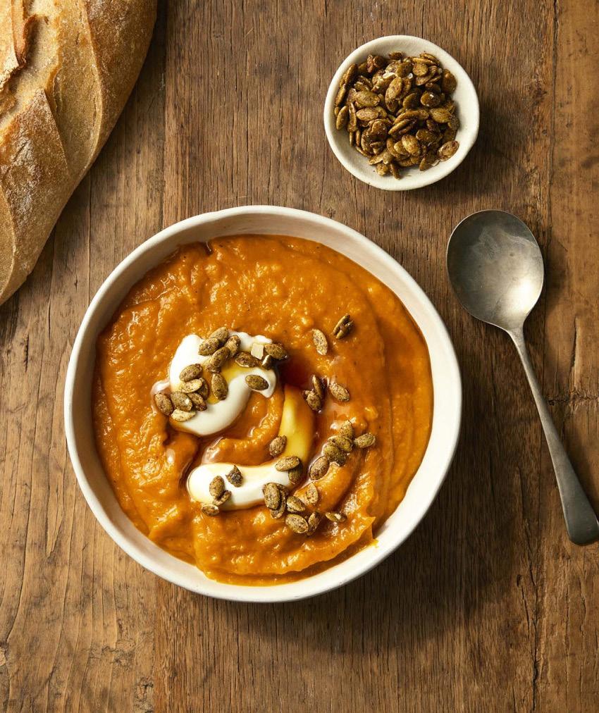 Ladle into warm bowls and top with a dollop of yoghurt and pumpkin seeds.