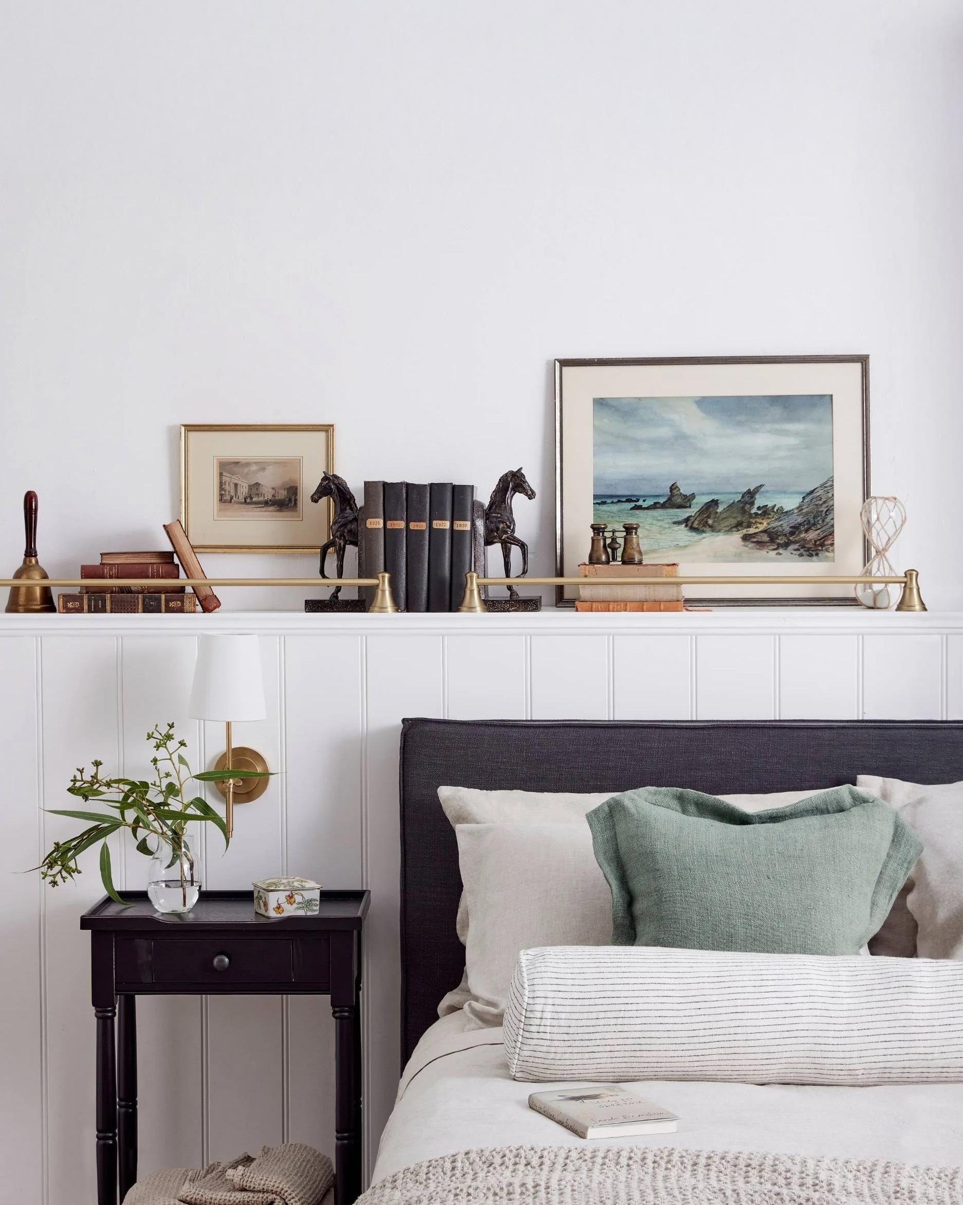 As an example, if hanging art above a piece of furniture, like a bed or a sideboard, an eye-level hang will leave it floating too high. Try a lower position – 15cm above the furniture is a good place to start.