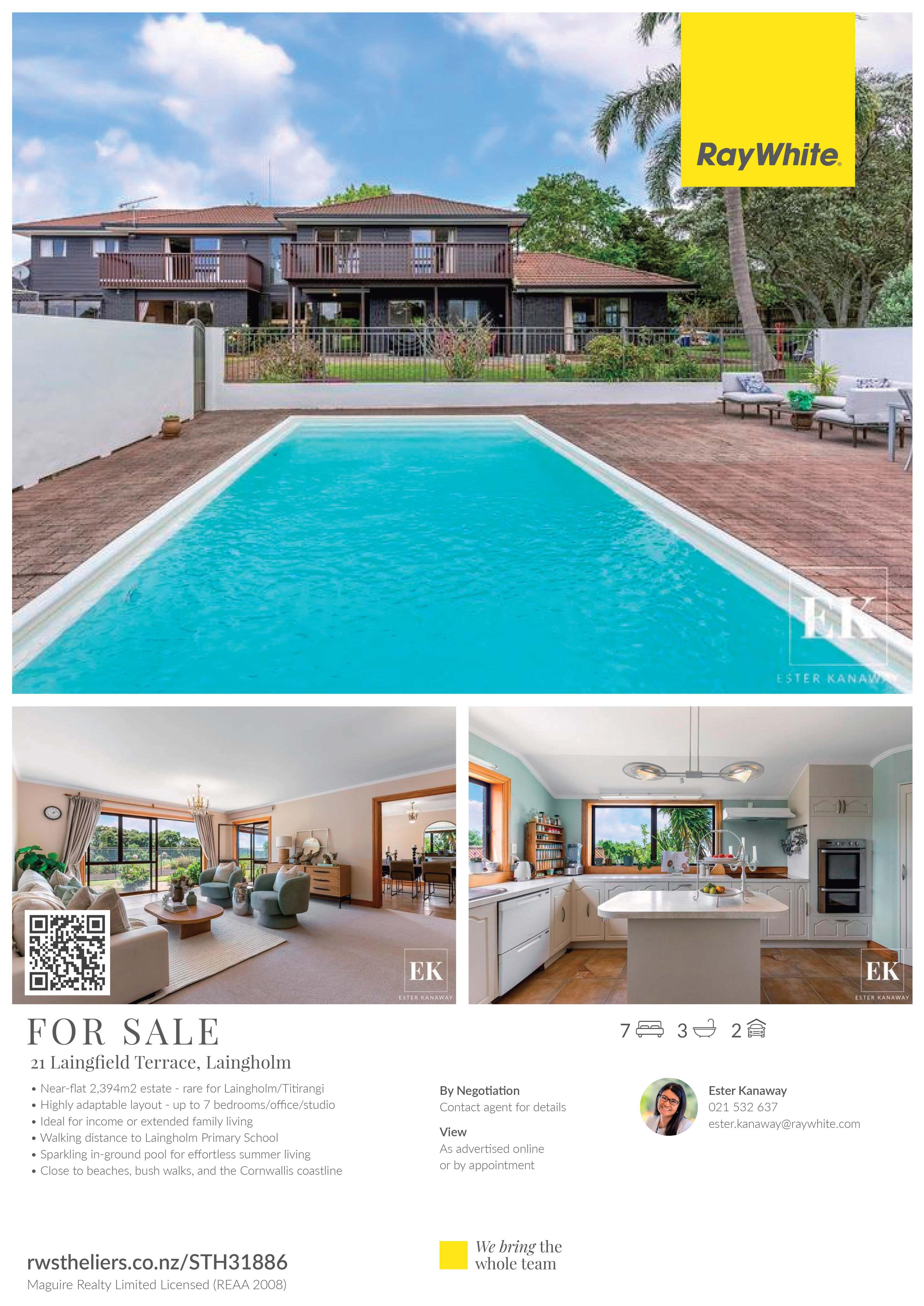 Further features include: an additional separate dwelling, ideal for long term guests, art studio, teenagers retreat or an office, separate laundry, double internal garage, significant storage, loads of OSP for children's cars, boat or your guests.