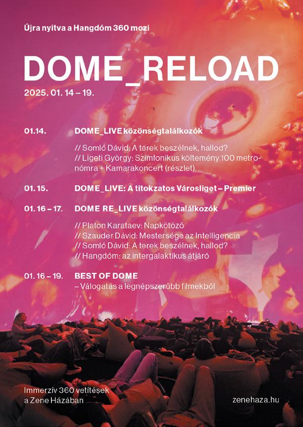 A két ünnep között napi néhány vetítéssel, majd január 14-től teljes műsoridőben újra nyitva a tetőtől talpig megújult Hangdóm, a Zene Háza egyedülálló, immerzív moziterme, amely igazi térbeli élménnyé alakítja át a félgömb alakú vászonra készített alkotásokat. Az átfogó fejlesztés során új, speciális projektor-rendszer és új vetítővászon érkezett, aminek köszönhetően az eddigieknél nagyobb kontraszttal és élesebb képpel kerülnek a vászonra az alkotások. Az eredmény? Még élénkebb 360 fokos moziélmény, amit az országban csak a Zene Házában élhetsz át!