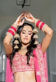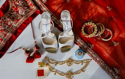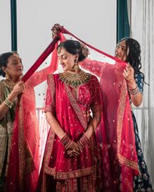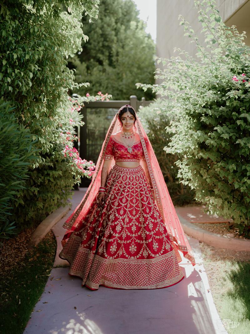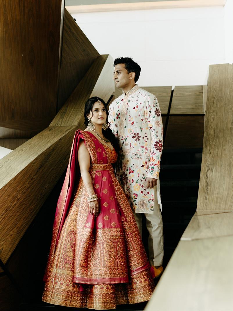 For her bridal look, Cynthia stayed true to tradition. “I always pictured myself in red,” she says. “Growing up, that’s what I associated with being a bride.” Her red lengha was both meaningful and timeless.