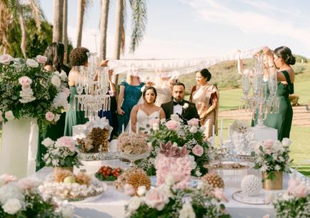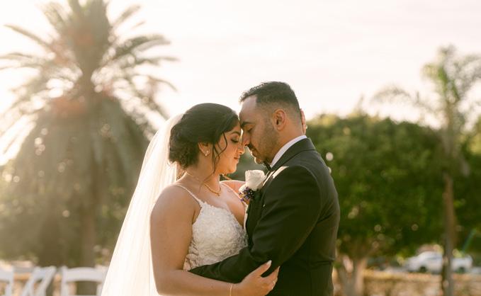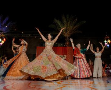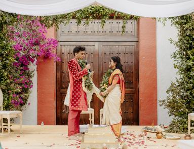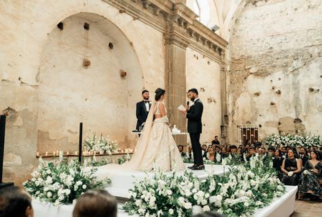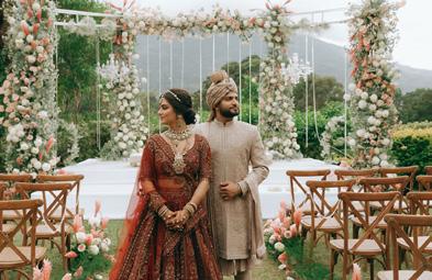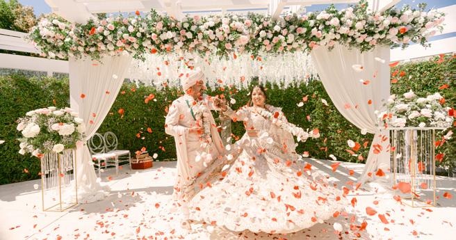 Their wedding in Mexico City was a joyful fourday adventure steeped in love and spontaneity. The ceremony was a riot of color—vibrant florals, natural wood textures, and a yellow hacienda backdrop. Neal led a lively baraat, beaming at the sight of loved ones dancing behind him, while Divya’s entrance was equally heartwarming, filled with waves and joyful greetings. They even exchanged personal vows, adding an intimate twist to their Hindu ceremony. The evening reception glowed in green and gold, elevated but relaxed. Specialty cocktails, an incredible DJ set, and non-stop dancing set the tone. The night ended with a hilarious twist—without a cake knife, Divya used a cocktail stirrer to cut the cake, and guests eventually dove in hands-first. One of their favorite photos? Their sisters were eating cake straight from the platter.