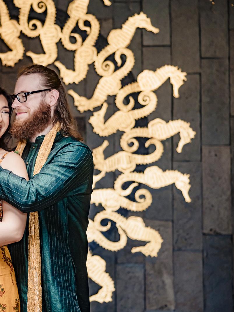 Their wedding ceremony was a heartfelt fusion of cultures, held beneath an elegant mandap overlooking the ocean—a perfect reflection of their shared journey and blended traditions.
