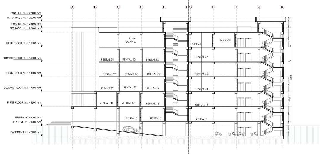 BASEMENT lvl.: - 3900 mm. GROUND lvl.: - 1200 mm. PLINTH lvl.: ± 0.00 mm. FIRST FLOOR lvl.: + 3900 mm. SECOND FLOOR lvl.: + 7800 mm. THIRD FLOOR lvl.: + 11700 mm. FOURTH FLOOR lvl.: + 15600 mm. FIFTH FLOOR lvl.: + 19500 mm. TERRACE lvl.: + 23400 mm. U. TERRACE lvl.: + 27300 mm. PARAPET lvl.: + 24600 mm. A T R I U M 1 2 3 4 5 6 7 8 9 10 RENTAL 6 RENTAL 4 RENTAL 3 RENTAL 16 RENTAL 11 RENTAL 10 RENTAL 26 RENTAL 24 RENTAL 23 RENTAL 37 RENTAL 36 RENTAL 35 RENTAL 52 RENTAL 47 RENTAL 46 ZUMBA OFFICE CARDIO DN UP UP DN DN X Y 10 9 8 7 6 5 4 3 2 1 A B C D E F G H I J K 10 9 8 7 6 5 4 3 2 1 A B C D E F G H I J K Y X FEMALE LOCKER RROM MEN'S LOCKER ROOM SAUNA SAUNA ZUMBA MMA /BOXING OFFICE POWER LIFTING CARDIO MASSAGE CENTER STAFF ROOM