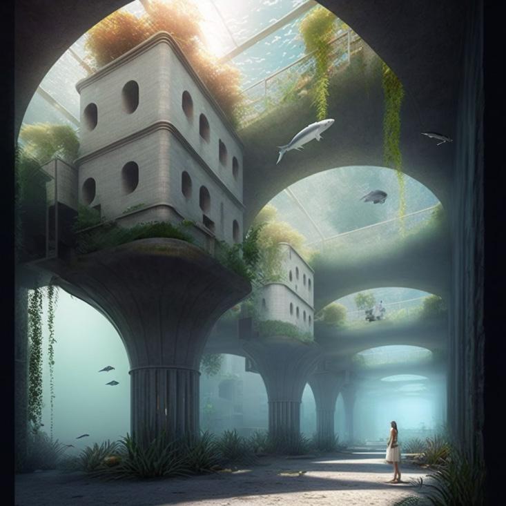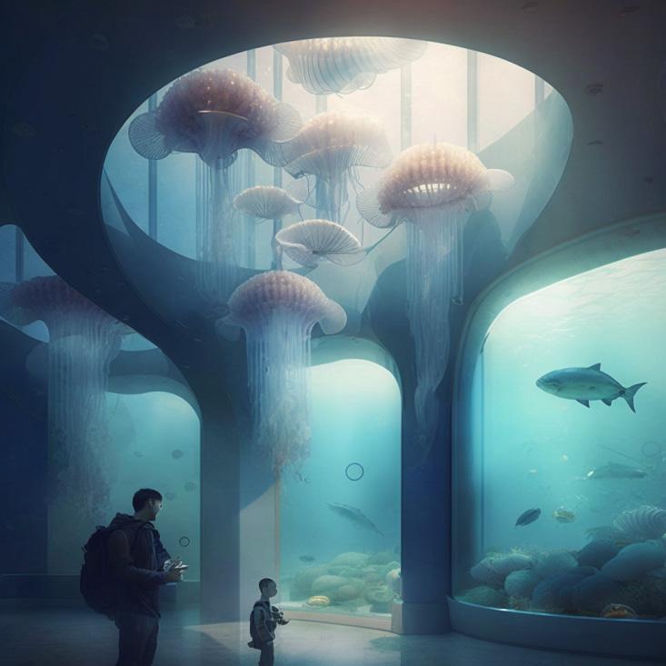 The image generated by Midjourney perfectly aligns with our design hypothesis, which centers around the influence of aquatic species on architectural spaces. This captivating image effectively portrays a structure resembling a jellyfish, demonstrating how such a design can integrate aquaponic farming concepts. It offers a visually intriguing representation of how the natural characteristics of jellyfish can inspire and inform the architectural elements, resulting in a harmonious blend of aesthetics and functionality.