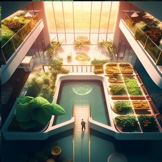 The image generated by Midjourney showcases an intriguing arrangement of voluminous spaces, where a single roof and interconnected floors visually connect different areas. This particular space exemplifies a holistic approach to farming, as it incorporates farming throughout rather than confining it to a single designated area. This design choice emphasizes the central concept of promoting hydroponic farming, creating a visual focal point within the overall space. The image portrays a dynamic and integrated environment that encourages exploration and engagement with sustainable agricultural practices. It presents a compelling vision for the future of farming and its integration into architectural spaces.