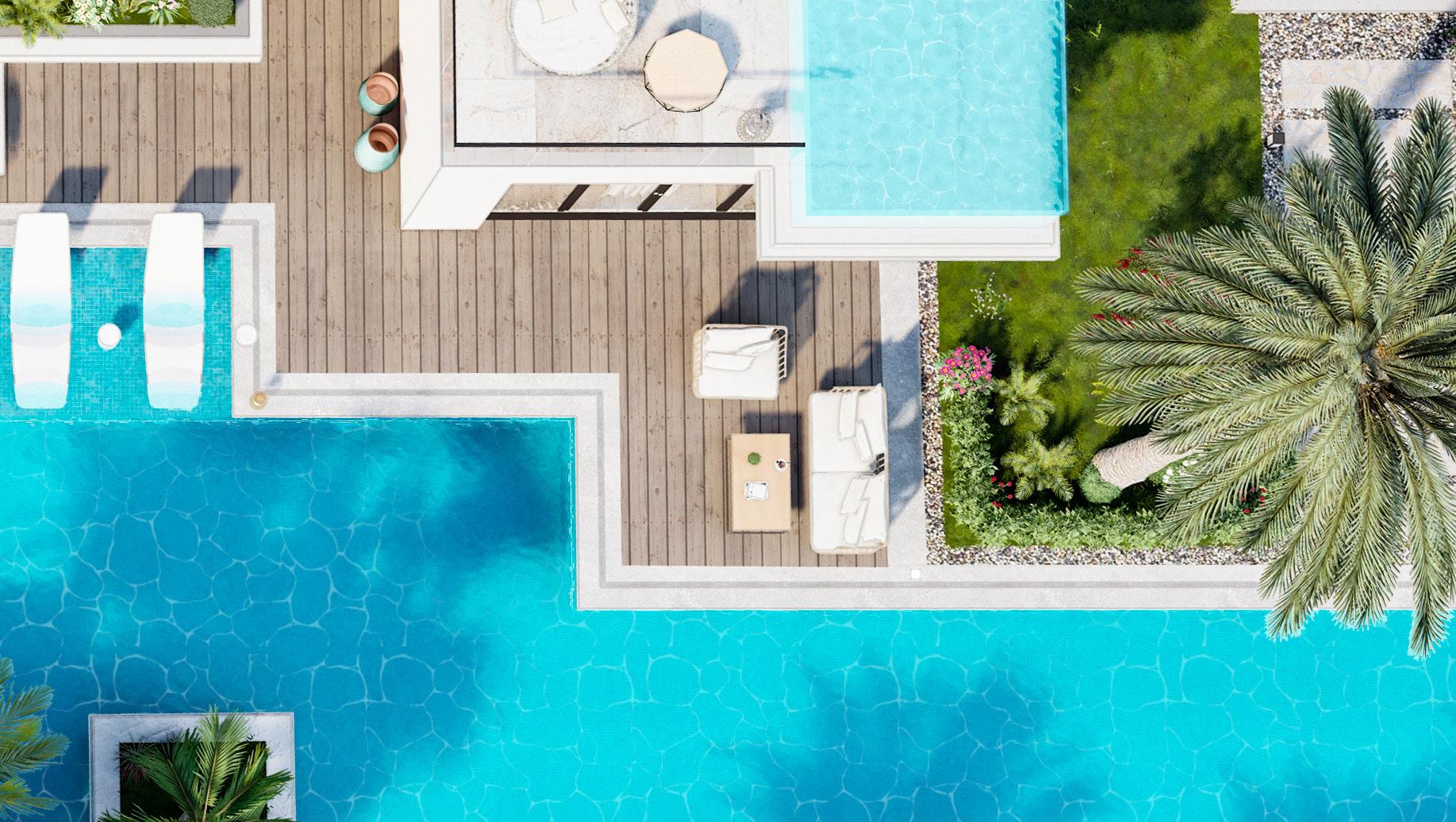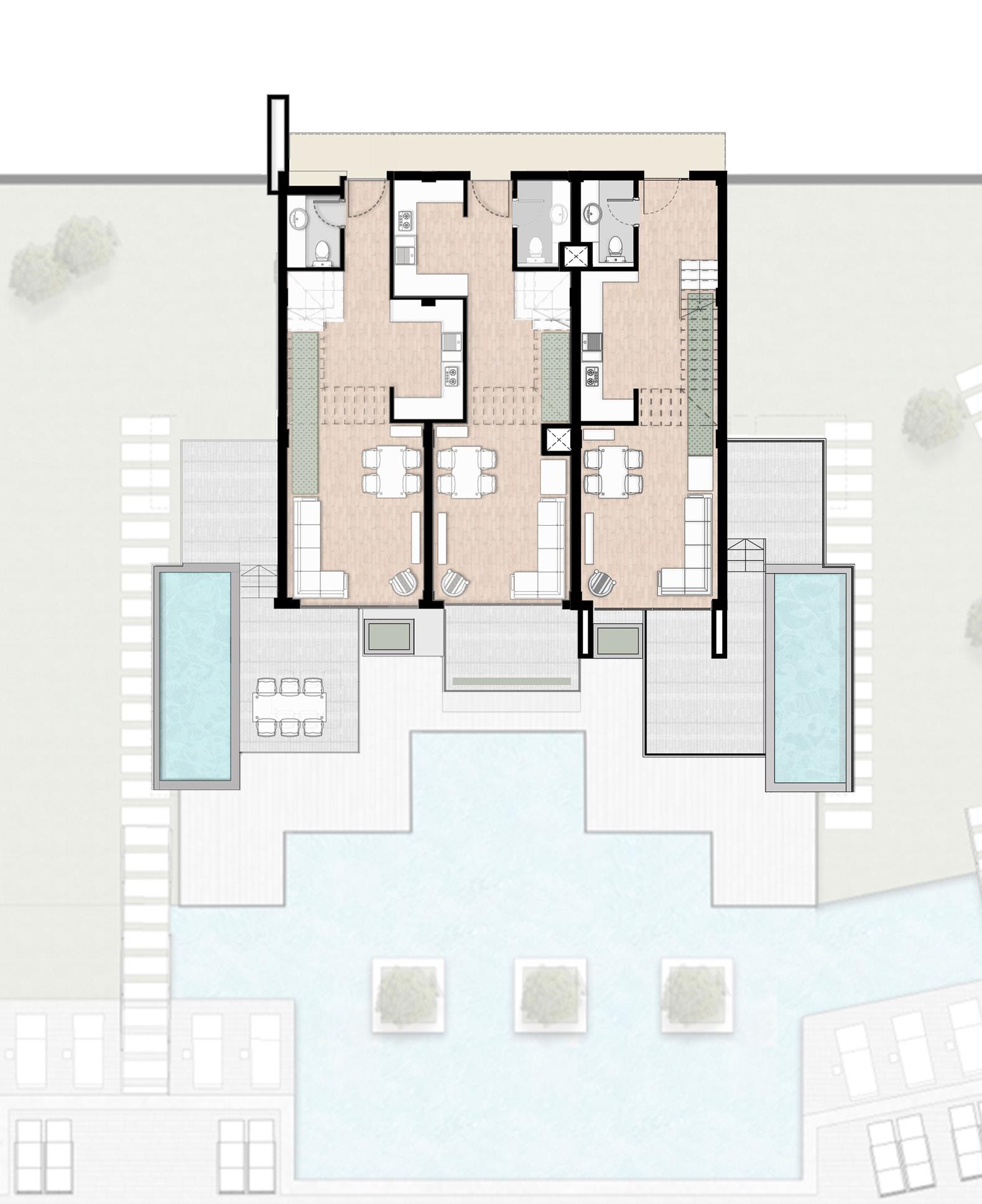 The 3 floors design allows a unique look into the vast landscape around residential units where you can enjoy the pool and the garden on the ground floor, and a calming terrace on the first with a basement to accommodate any extra facilities you need.