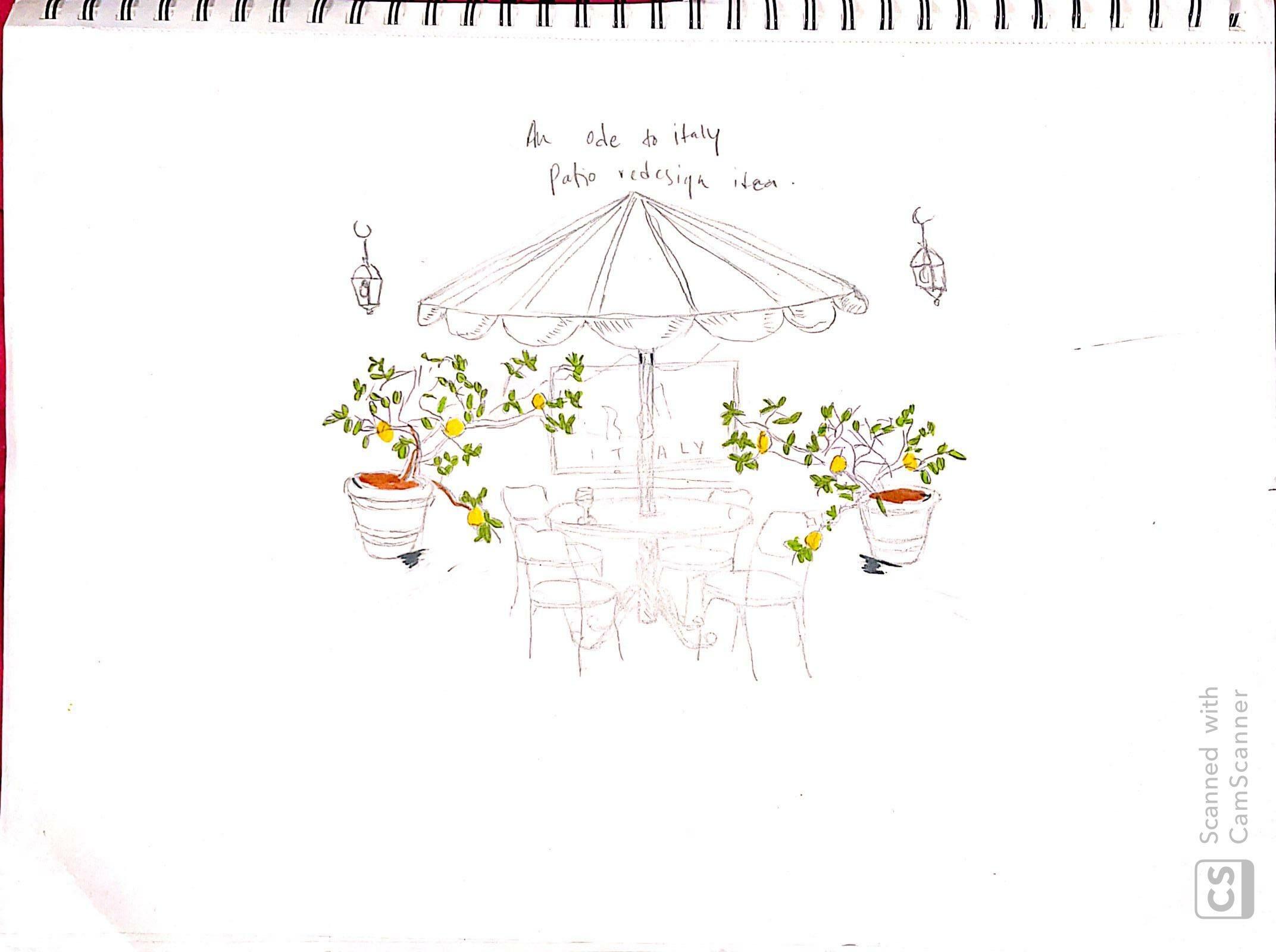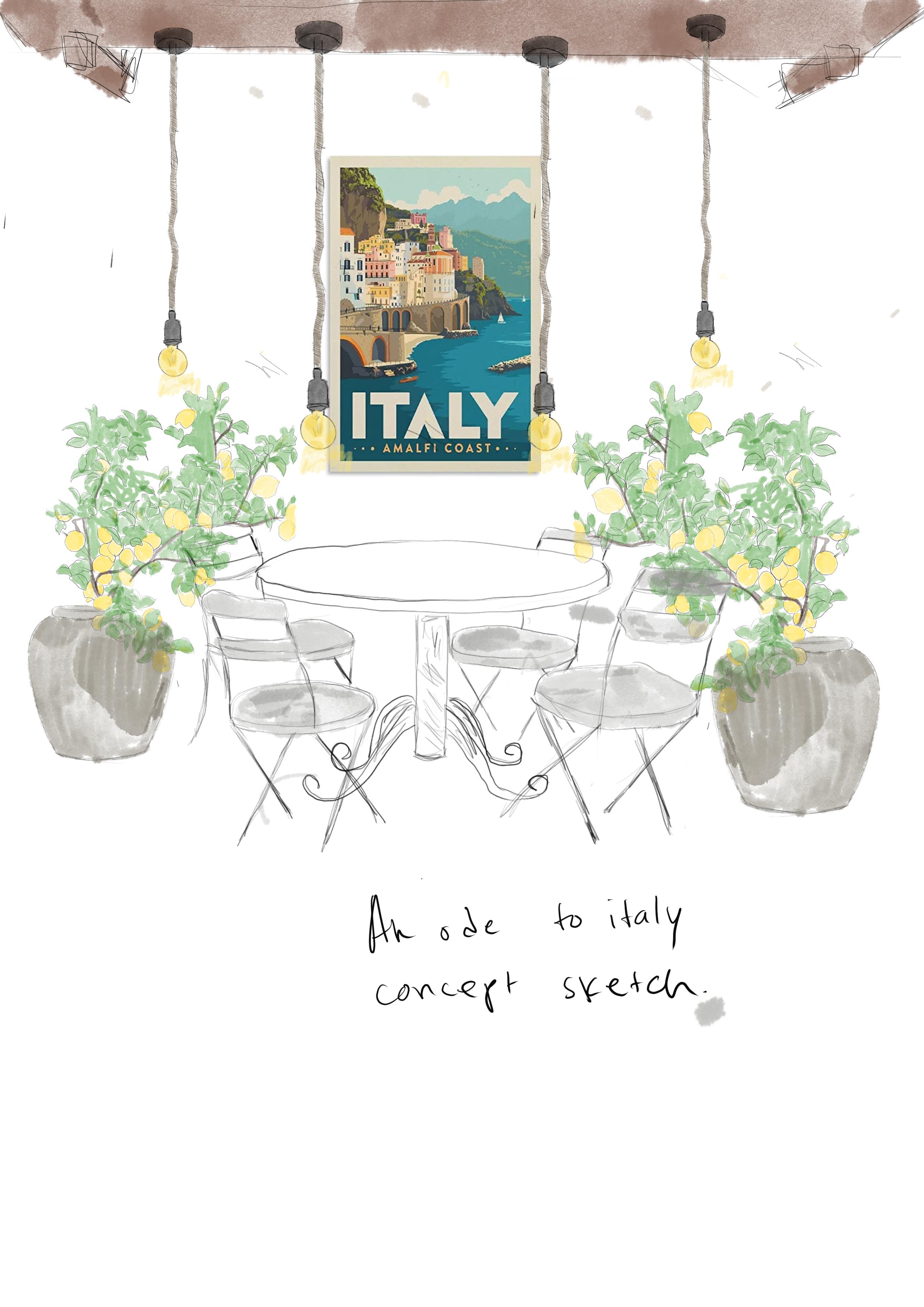 The concept sketch for An Ode To Italy was largely inspired by my fascination and love for Italy, more specifically inspired by Restaurant da Paolino in Capri, Italy. The sketch is a patio redesign, featuring lemon trees growing out of minimalist grey stone pots, and a very casual seating arrangement complemented with hanging rope lights.