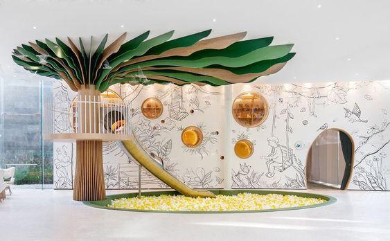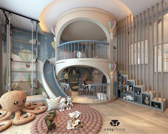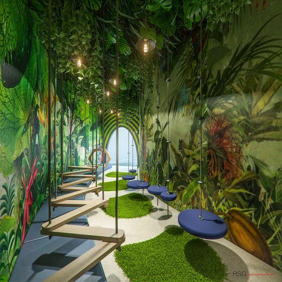 For the indoor sensory room, I wanted to create an interactive space with a multipurpose treehouse like slide set including stairs to climb up to the second story, and a sitting/sleeping area in the lower story. Along with that, I included an indoor jungle gym challenge.