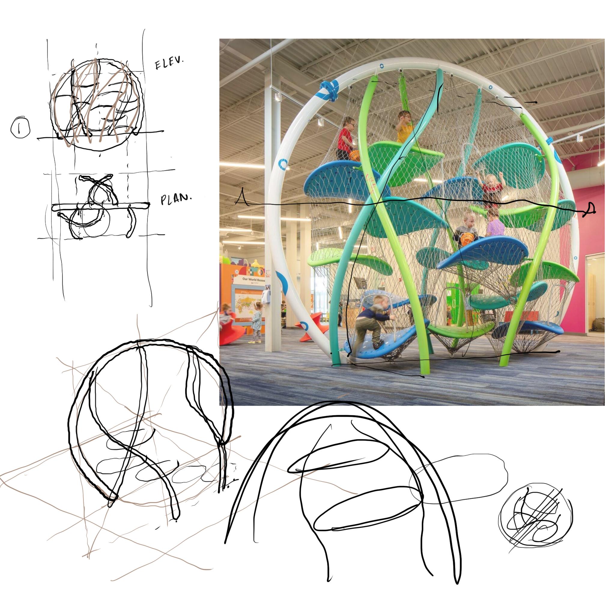 A challenge I faced was adding the "Luckey Climbers" interactive play area to the floor plan. During my research, luckey climbers' vision of offering "adventures to kids of all ages while challenging them to problem-solve, think spatially, and most of all, be kids with other kids" really appealed to me and seemed suitable for the space I was designing (an outdoor sensory playground). However, I struggled with adding its top view into AutoCAD. I solved this problem by studying the Luckey Climber and sketching its elevation, 3d orientation, and top view.