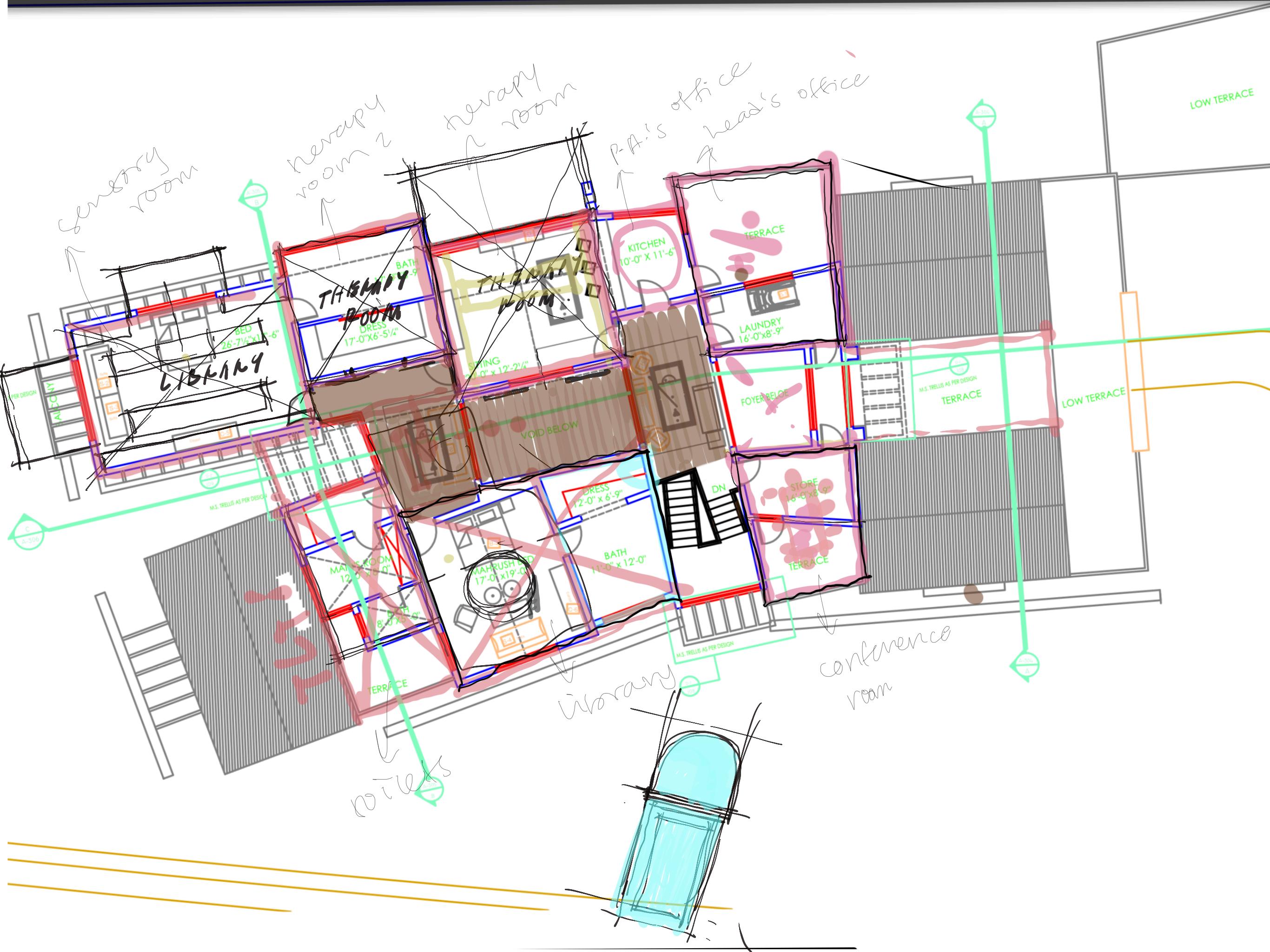 Before making changes to the blueprint plan of the site on AutoCAD, I made rough changes to the plan digitally. This allowed me more flexibility in terms of any changes that had to be made or anything that I felt needed to be removed from the plan entirely. For example, I had worked out an idea of adding an elevator to the plan, but later decided against it due to lack of space.