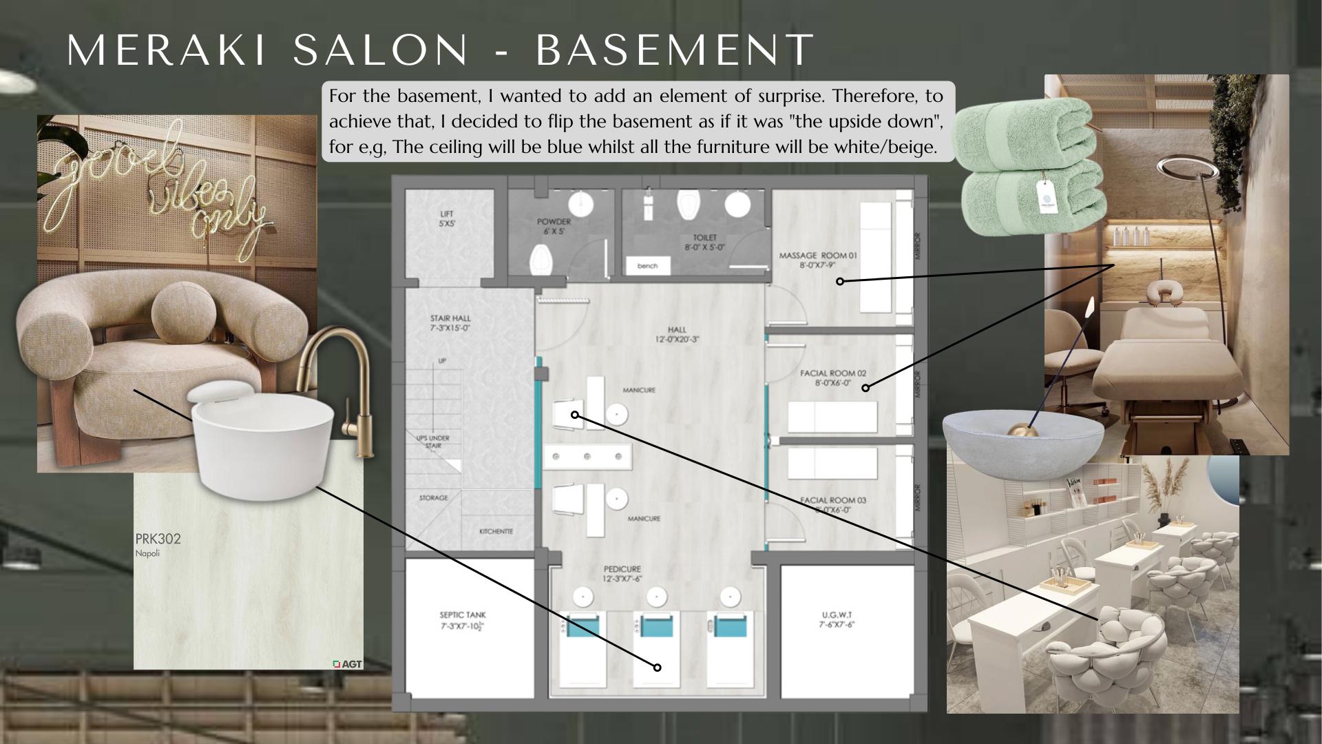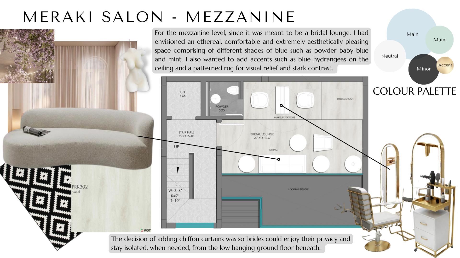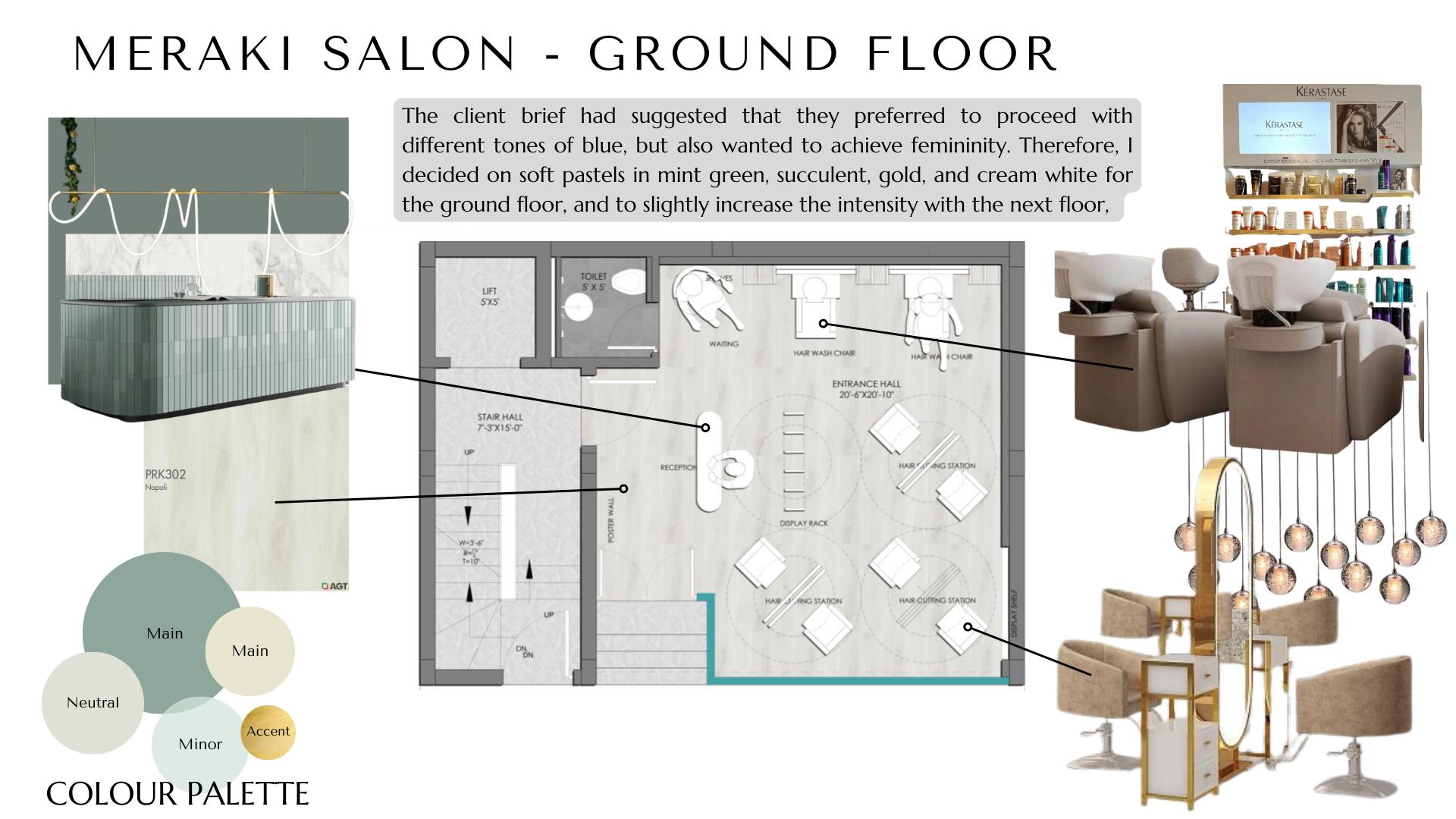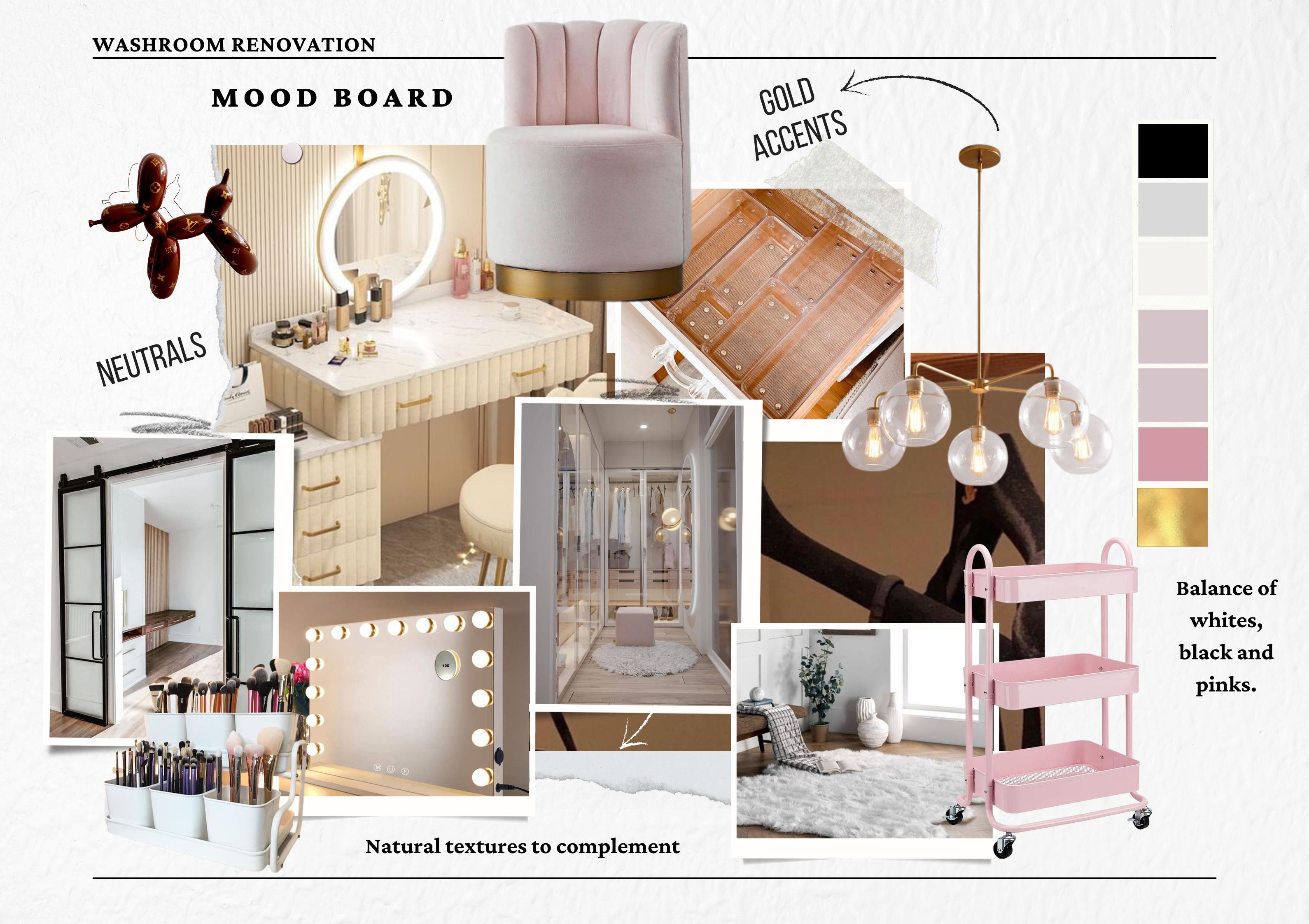 The mood board I created for this project was based on a minimalist and modern design style where the neutral colours and tones are in harmony with the existing natural textures (wood tiles, translucent sliding closet doors, chestnut wood) and the balance is established with the addition of pinks in the form of sliding trolleys and the blush pink vanity chair clad in suede. The gold accents would also add a sense of flair and look visually appealing.