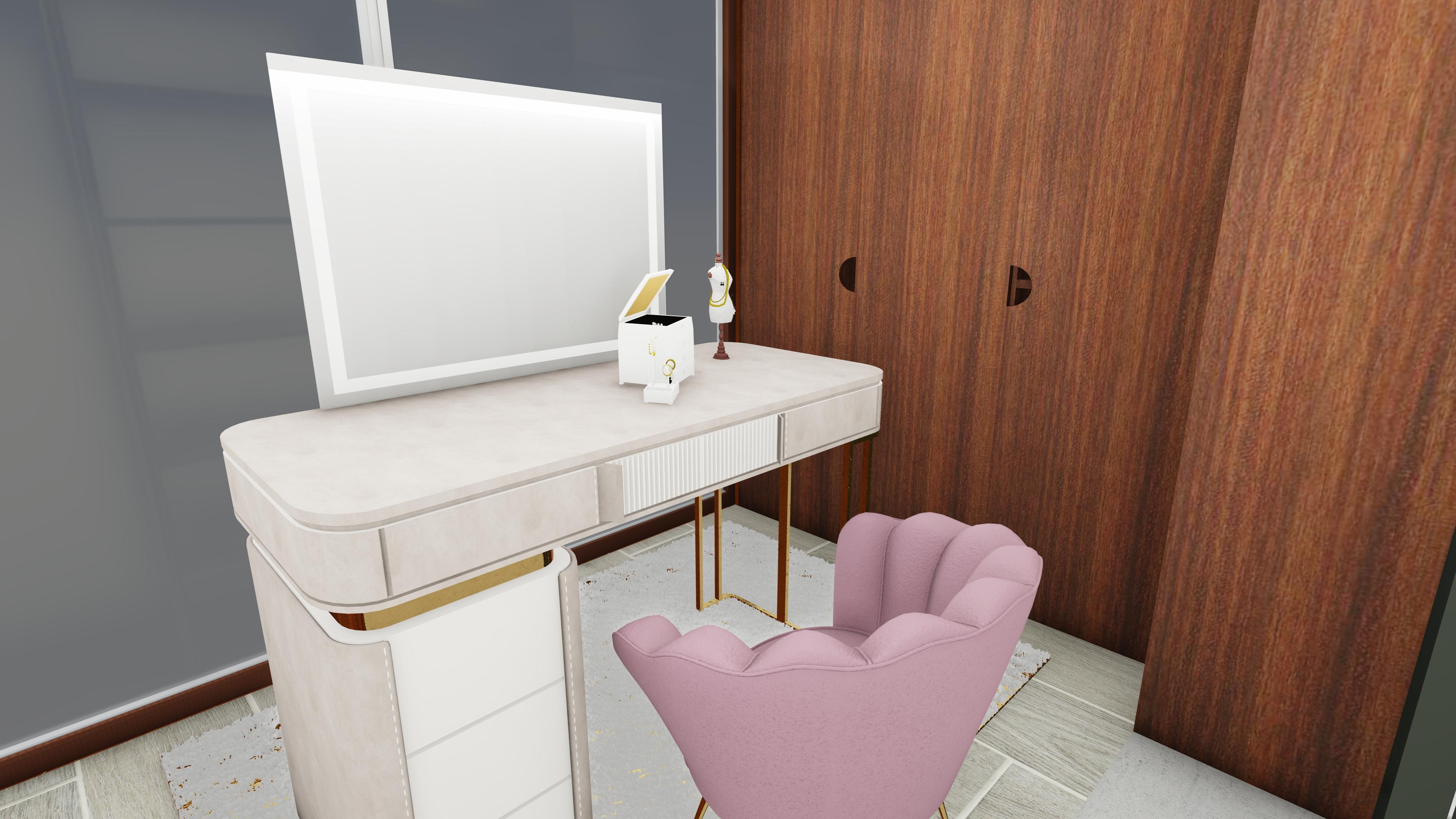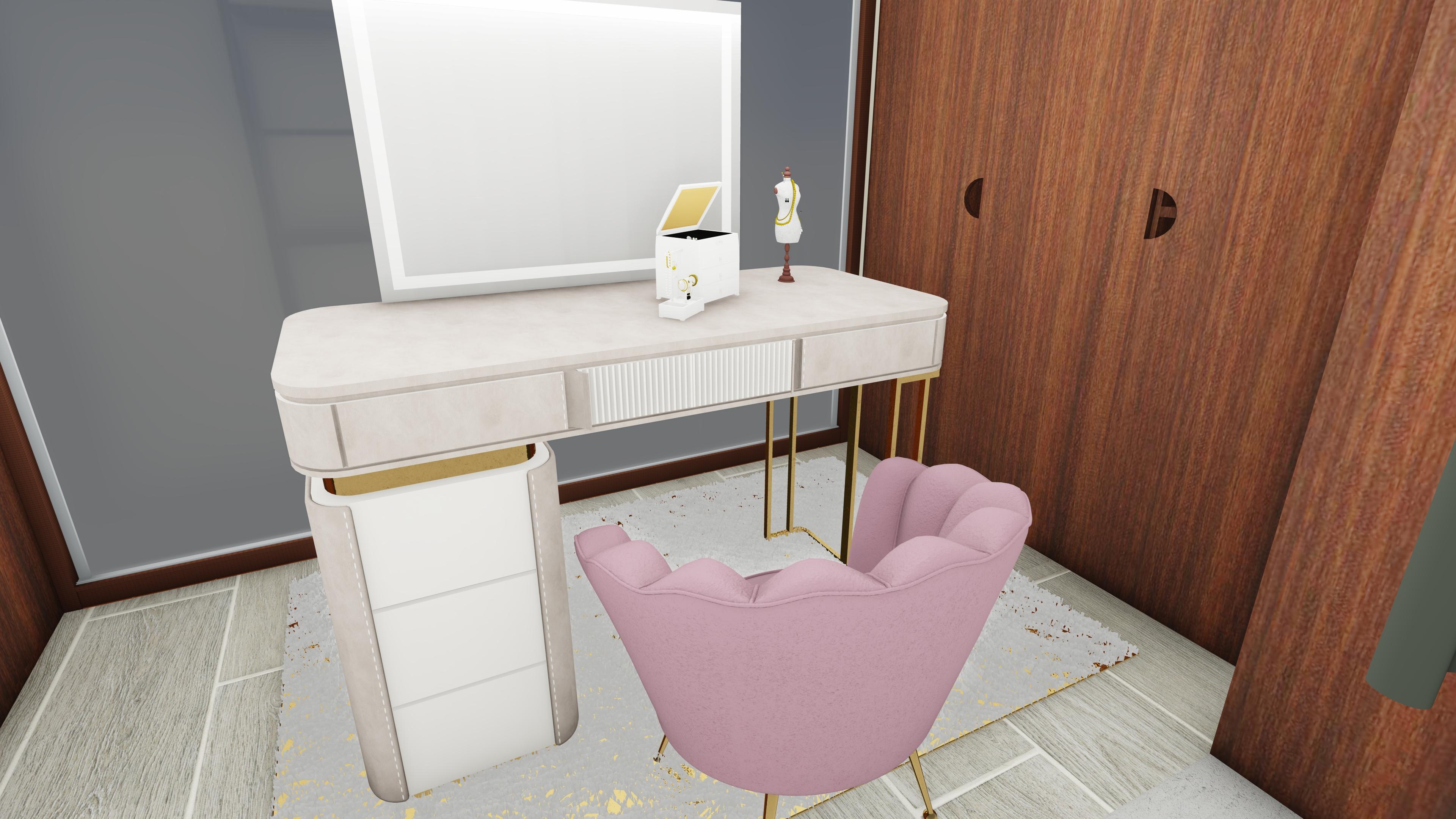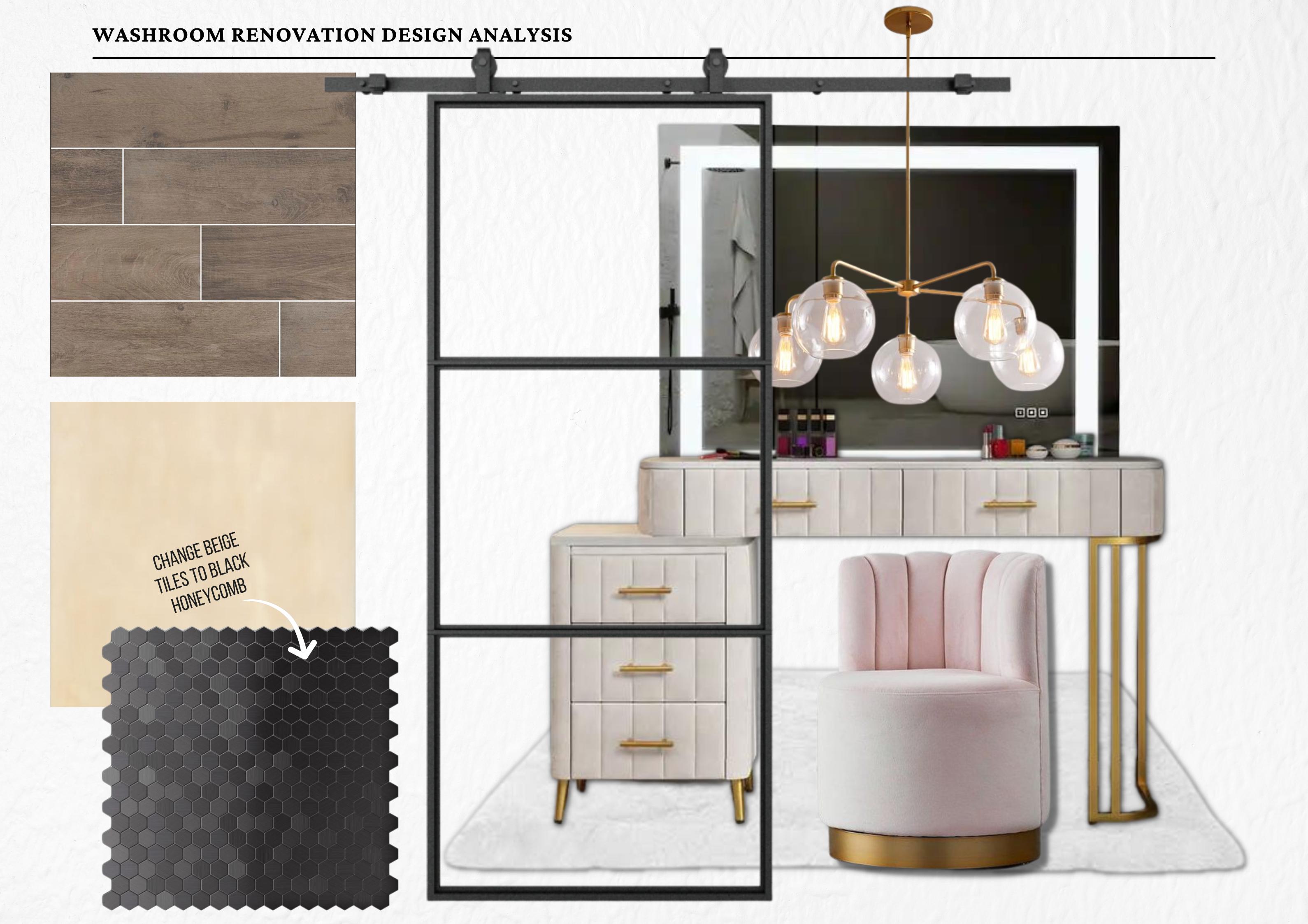 I designed this vanity room for myself; for someone who loves neutral colours such as white and black, and also prefers highlights of pink. I also grew tired and bored of the beige tiles that surround the exterior of the dressing room, and decided that I wanted to change it to black honeycomb patterned tiles. The honeycomb tiles would also be practical in the long run as they would be easy to take off if I ever change my mind and want to switch back to beige.