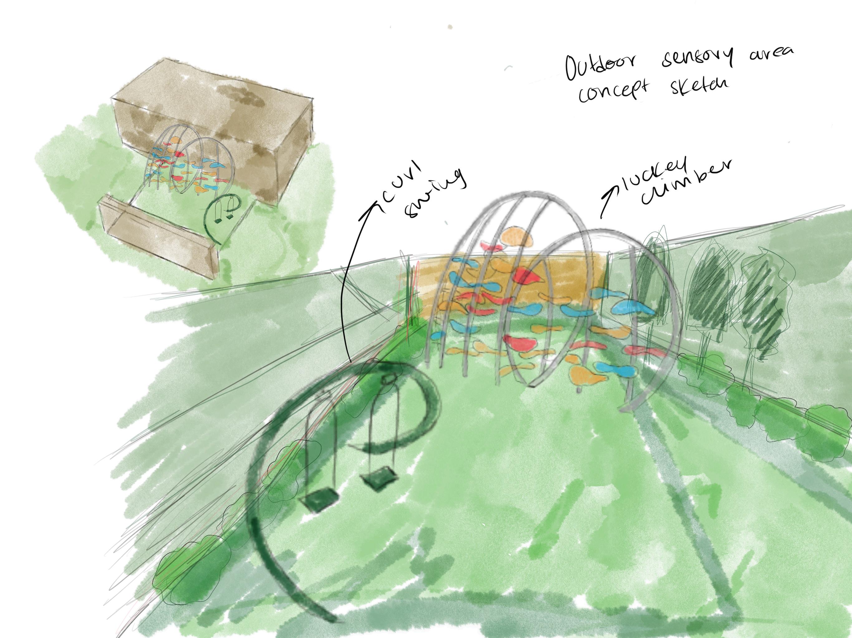 For the outdoor sensory playground, I wanted to incorporate balance board see saws, an ergonomic curled swing and a Luckey Climber. All of these products in an outdoor setting would increase sensory play, encourage communication and result in positive reactions to stimuli.