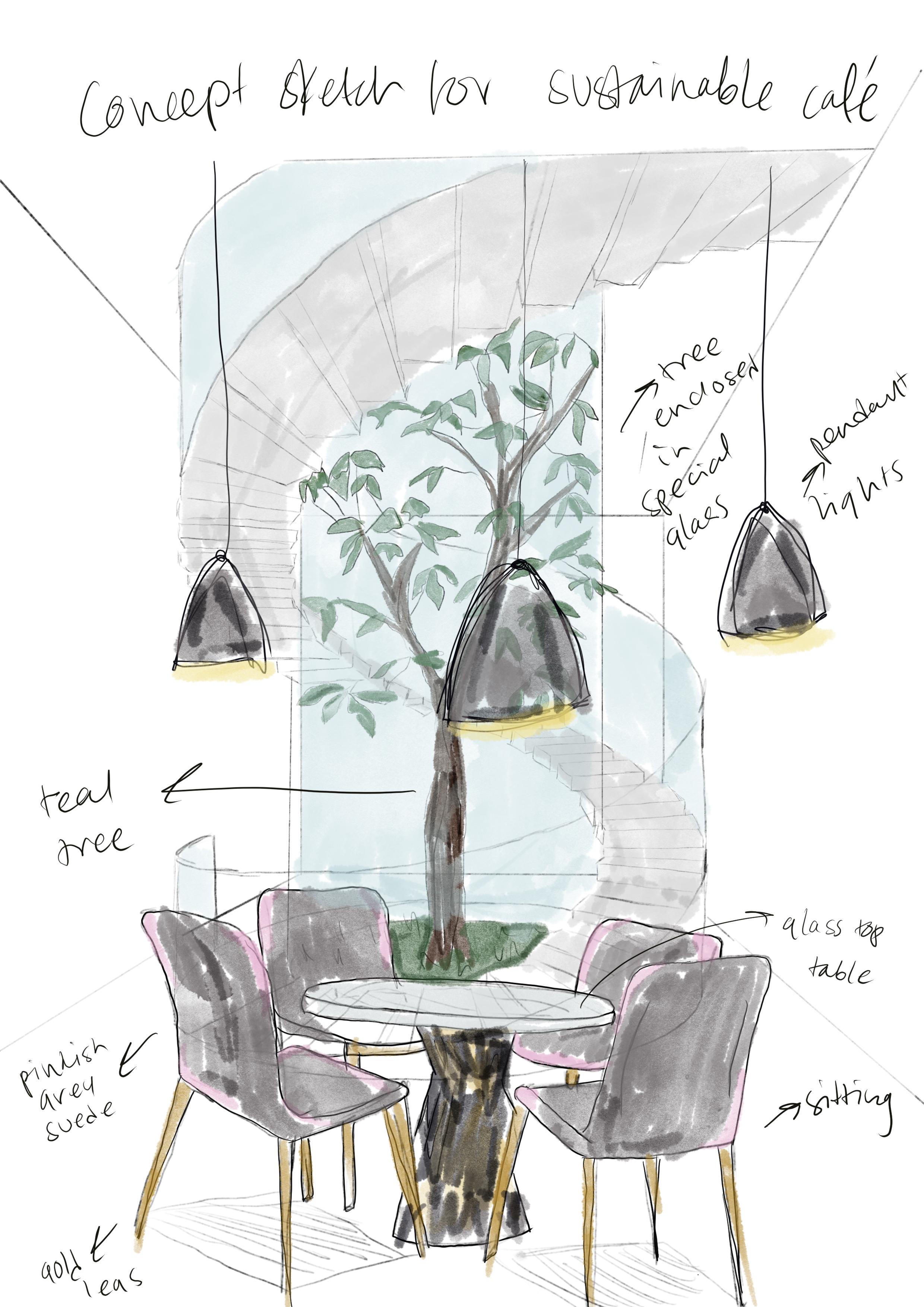 The concept sketch for the sustainable café was inspired by treehouses; how stairs or ladders lead one up to the treehouse. I wanted to recreate that idea for a restaurant, but in a unique and modern style that would feature an endangered species of a tree, enclosed in a special glass.