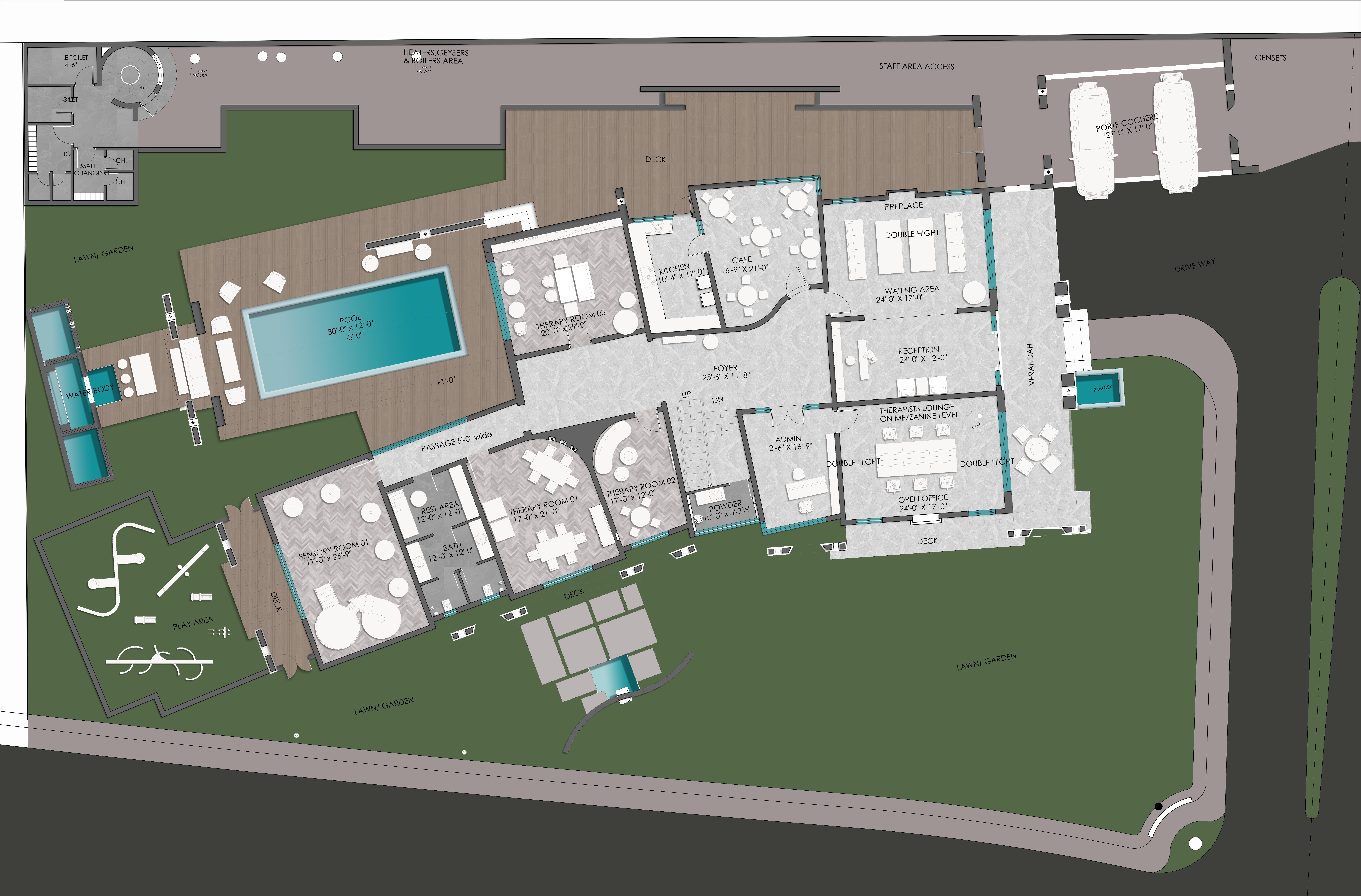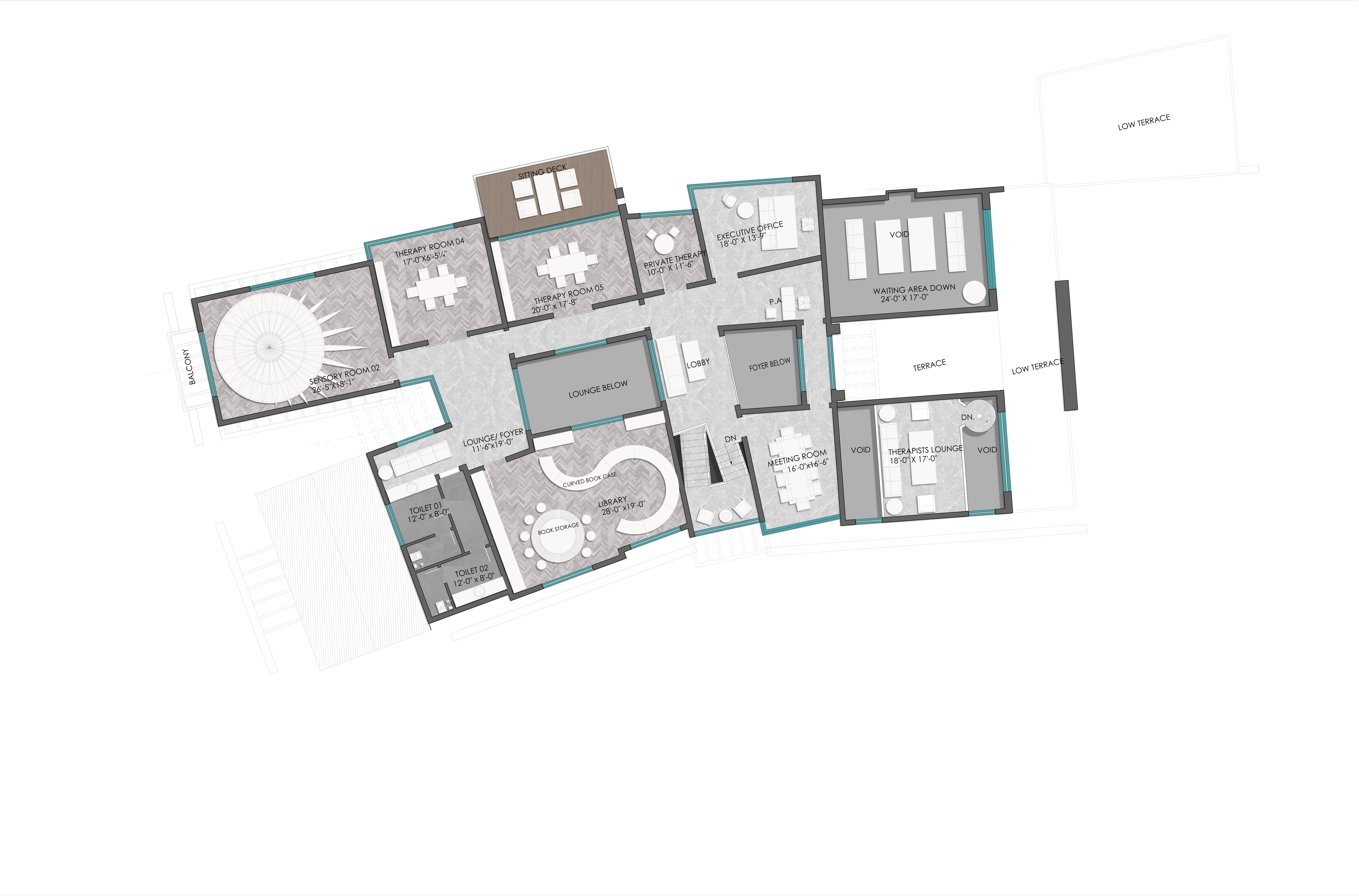 The room underneath has pitched roofs which made it perfect for a mezzanine addition. Therefore, I decided on a prefabricated steel structure to support the therapist lounge like a mezzanine loft.