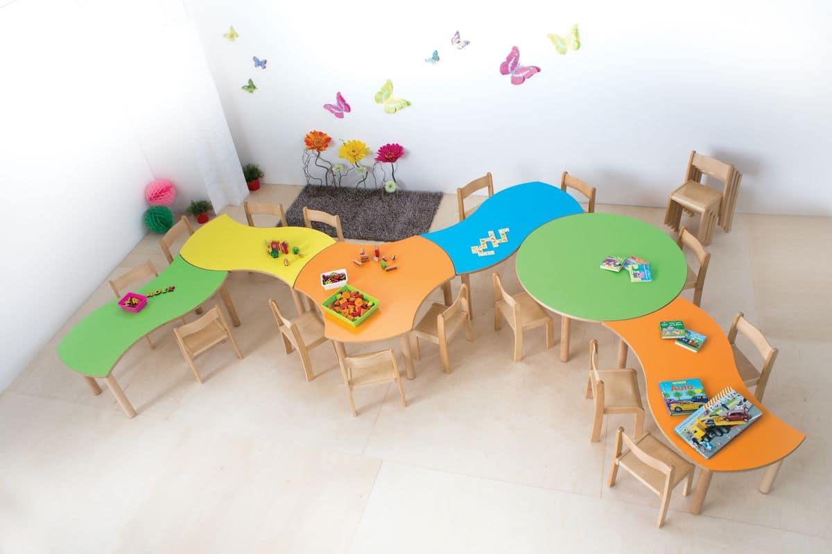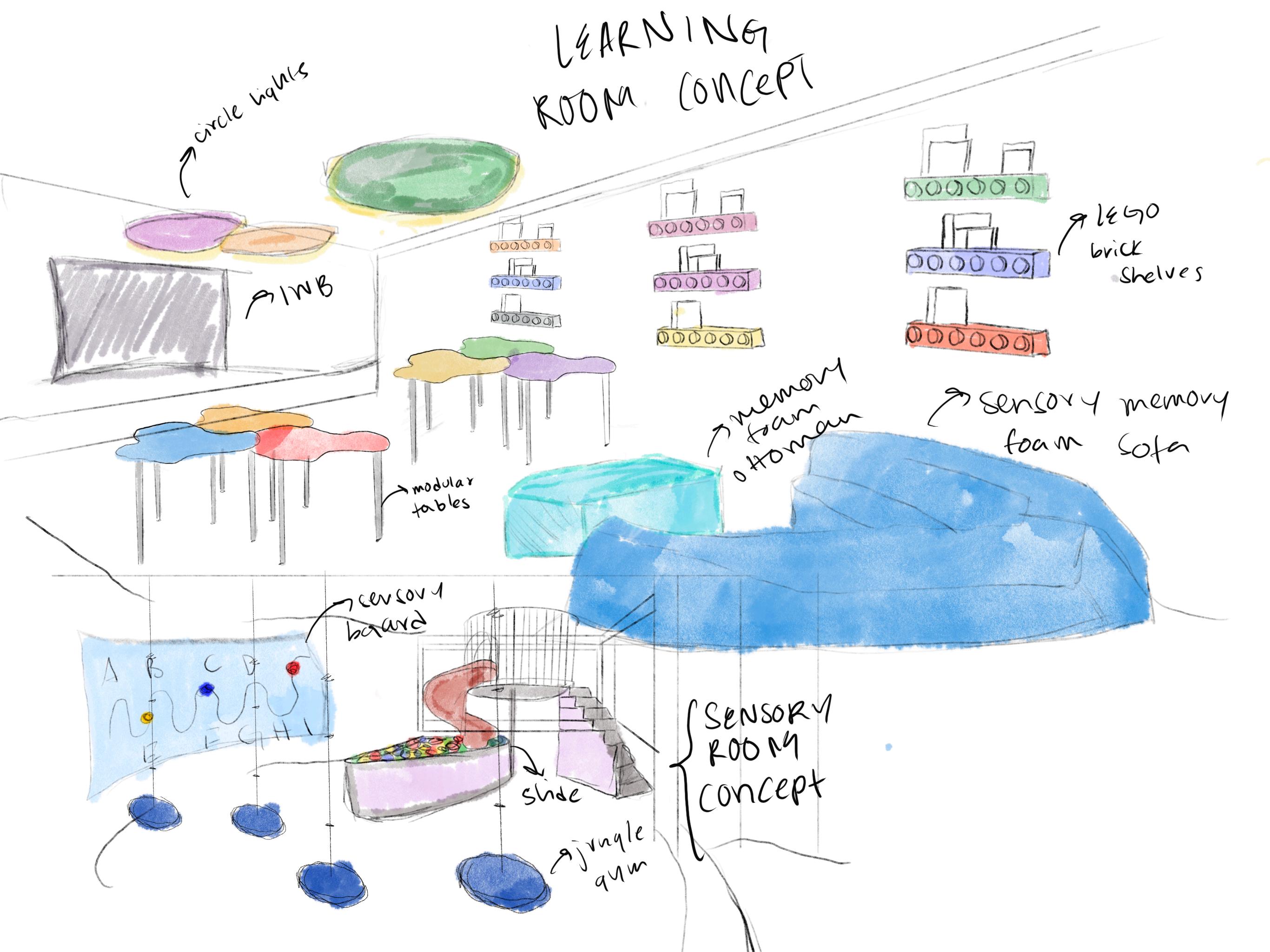 For the learning rooms/ therapy rooms, I wanted to incorporate soft colours (pastels) that are low arousal and don't overstimulate the neurodivergent mind. I also wanted the tables to promote interactiveness, so I added stackable tables and art tables.