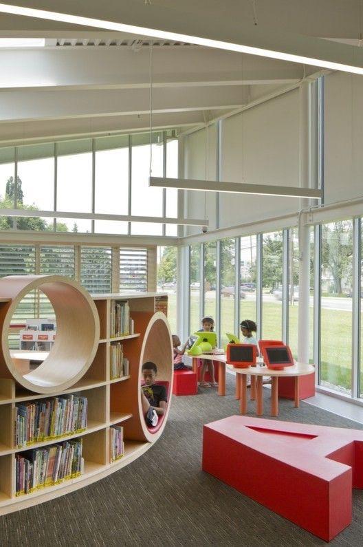 In the library, I wanted to include a curved bookcase with cushioned openings for the kids to sit. With ergonomic design, these openings would adapt to the human spine and allow back support.