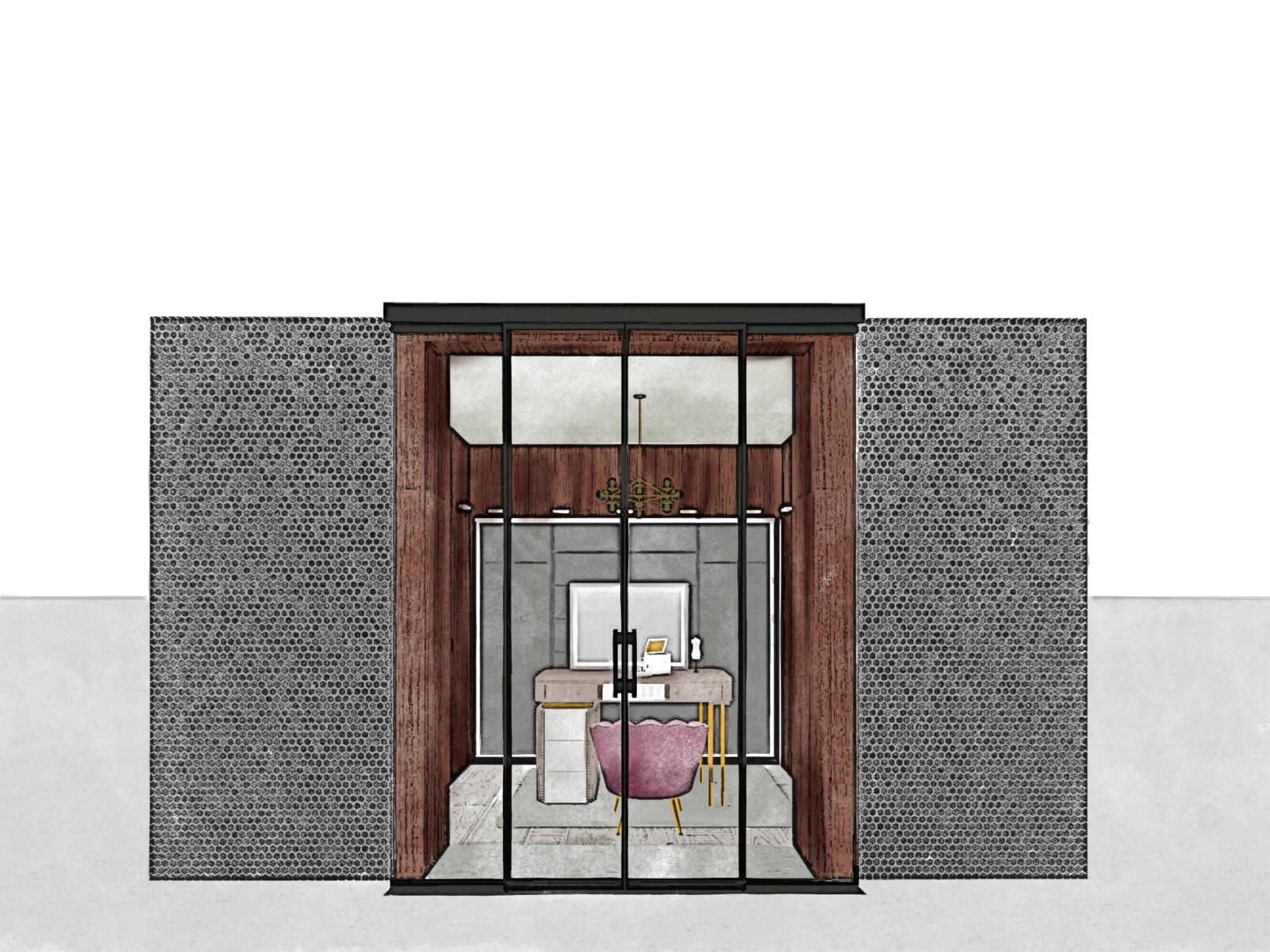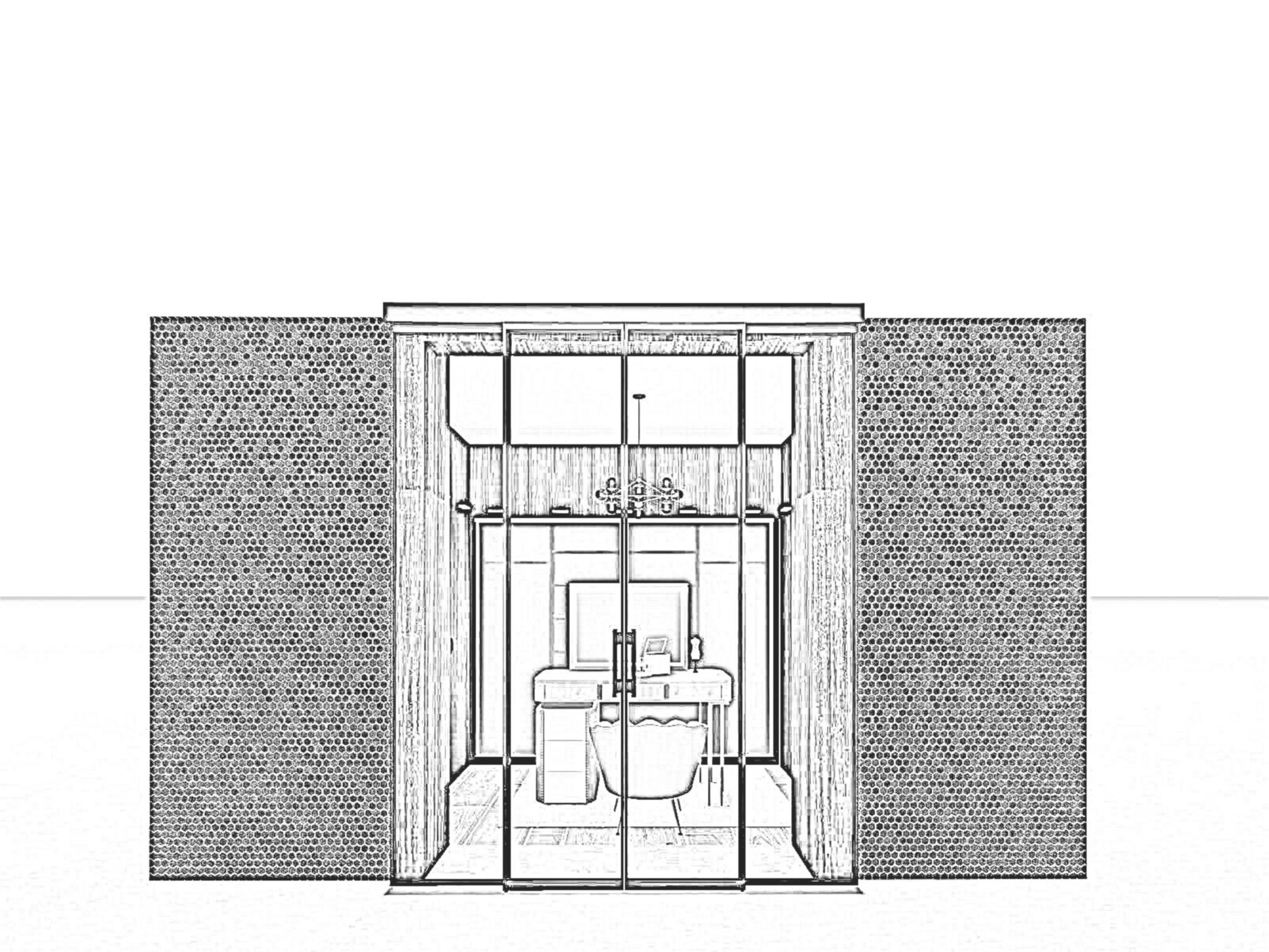 The floor plan for the dressing area had to go through various stages of development before I could present the final rendered floor plan. I started from a rough sketch in Procreate, which gave me a clearer idea of what furniture to place where, and to highlight the key changes. After doing so, I drafted the floor plan in AutoCAD to achieve accurate proportions. Then, I was able to take the drafted AutoCAD plan into Photoshop, where I first inverted the plan to convert it into black and white, and then continued to render the floor plan according to materials (wood, wood tile, marble top) etc.