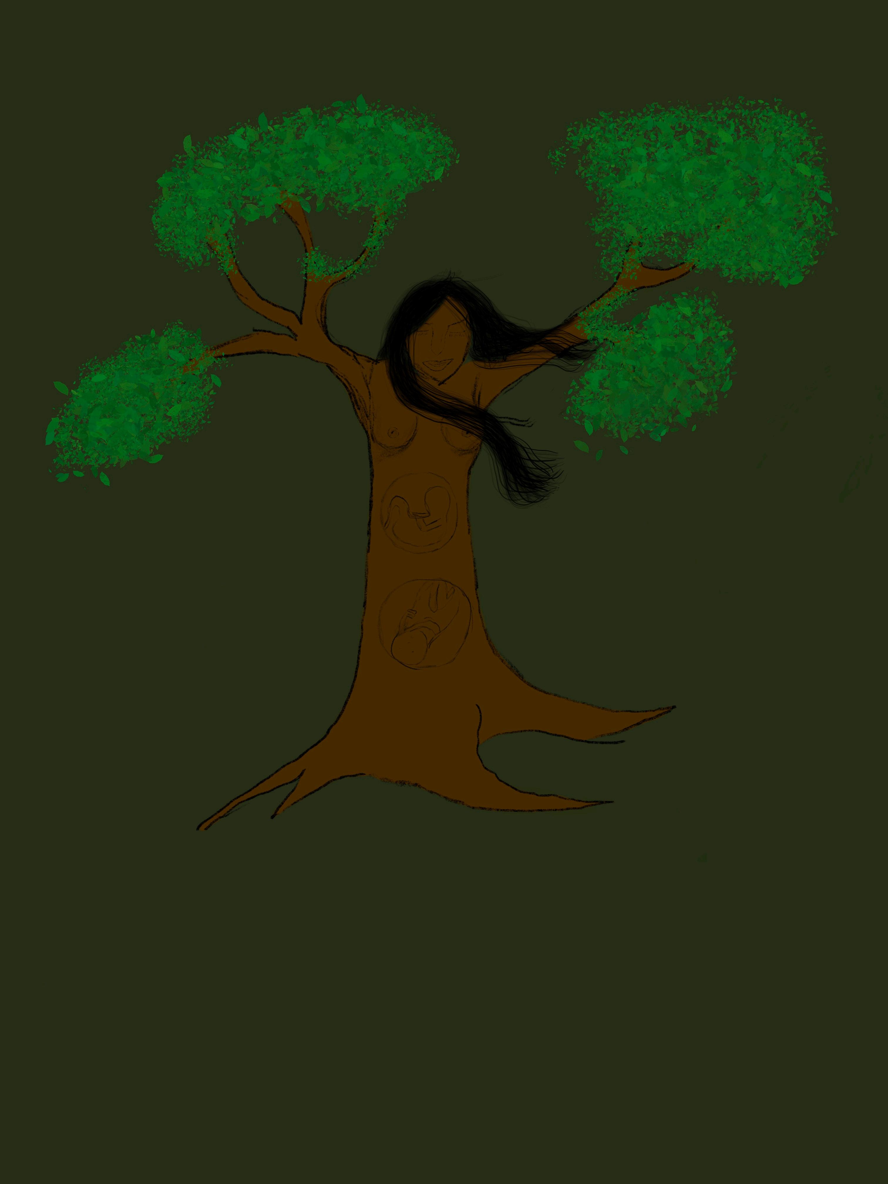 The theme of this artwork revolved around the process of rebirth, the personification of a woman as a tree of life, giving birth to life forms/humans. I also featured facial expressions, and tried to draw accurate representations of foetuses inside the tree of life, or “the mother’s womb”.