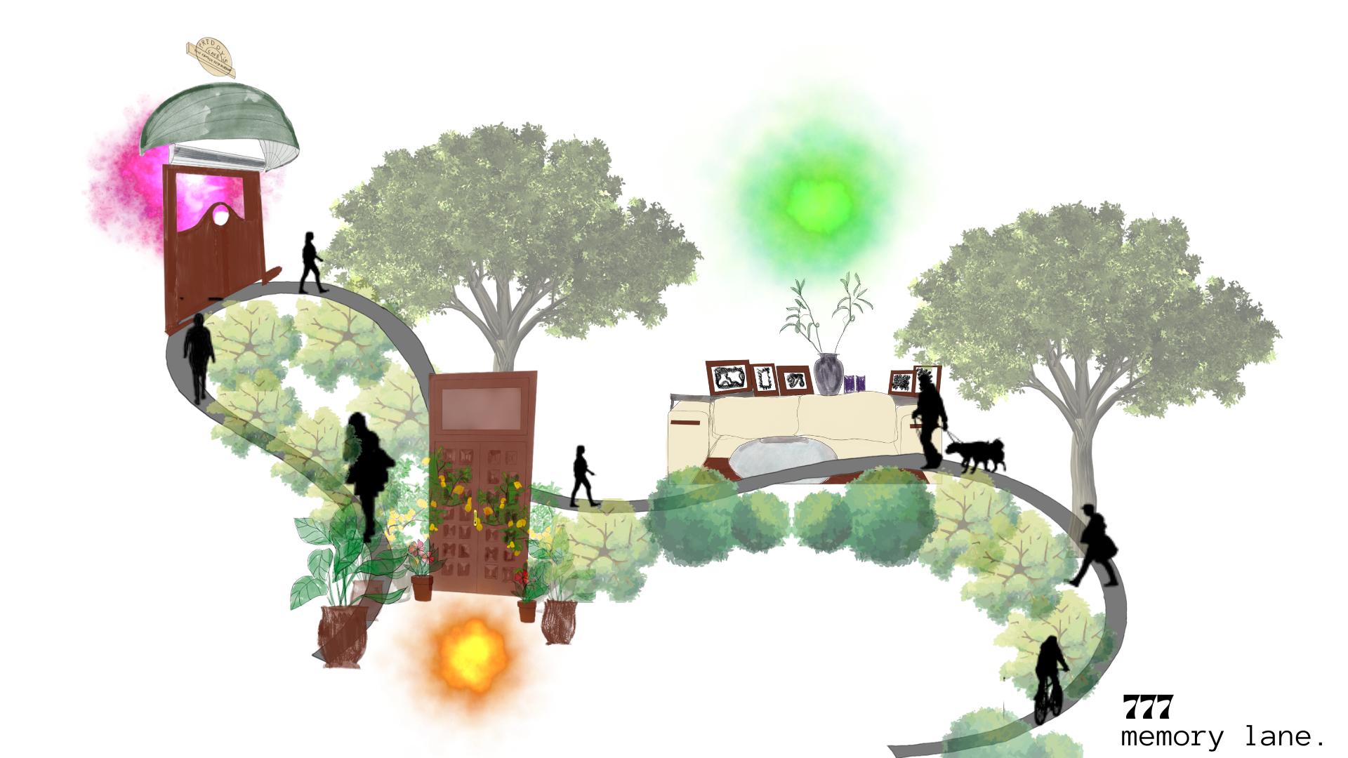 777 Memory Lane is a personal artwork that stemmed from a simple sketch of my grandfather’s front door. After that one simple sketch, I found myself completely overcome with emotions and realised how much I really missed my childhood. Suddenly, I found myself sketching the entrance of Freddy’s Café (a café that I would visit regularly with my family as a child) and the yellow sofa from my old house in Askari 9 (a small neighbourhood in which my parents shifted after their marriage and where we stayed as a family for 7 years before moving to our current house). I assigned it with the number 777 because the angel number 777 means “luck” and “good things are coming”. I also assigned auras to these landmark locations; orange for lasting relationships, pink for comfort, and green for personal growth and healing. The artwork is a representation of the little neighbourhood I’ve created in my mind; me walking down memory lane and reminiscing my childhood.