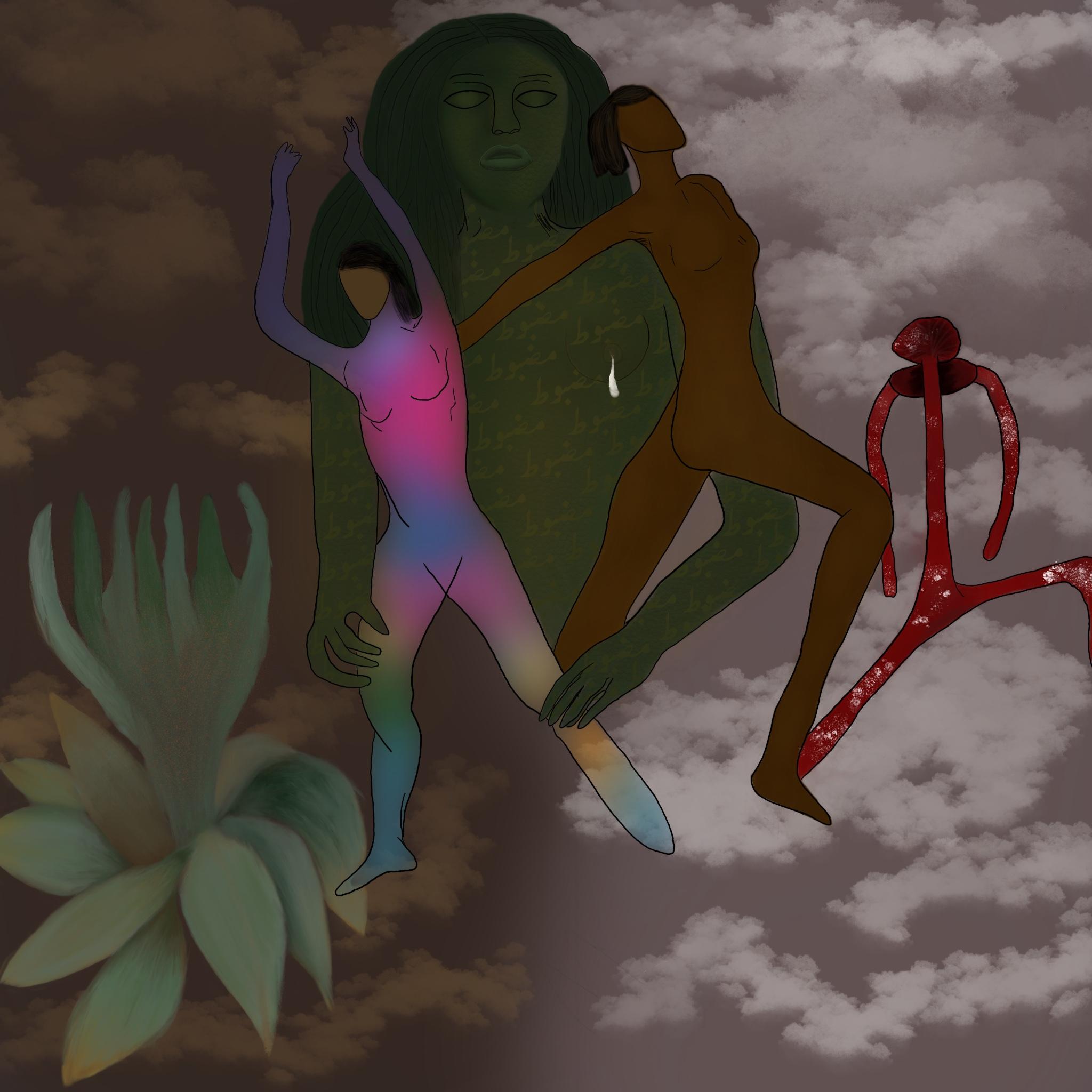 Divine Femininity is my personal artwork inspired by the three artists I studied; Frida Kahlo, Nancy Spero and Barbara Kruger. Gai’a, the green figure, expresses freedom in terms of the female body. Upon a closer look, Gai'a's body is embedded with text in my mother tongue, Urdu, which reads out the word "طوبضم “.When translated to English, the word means strong or resilient.