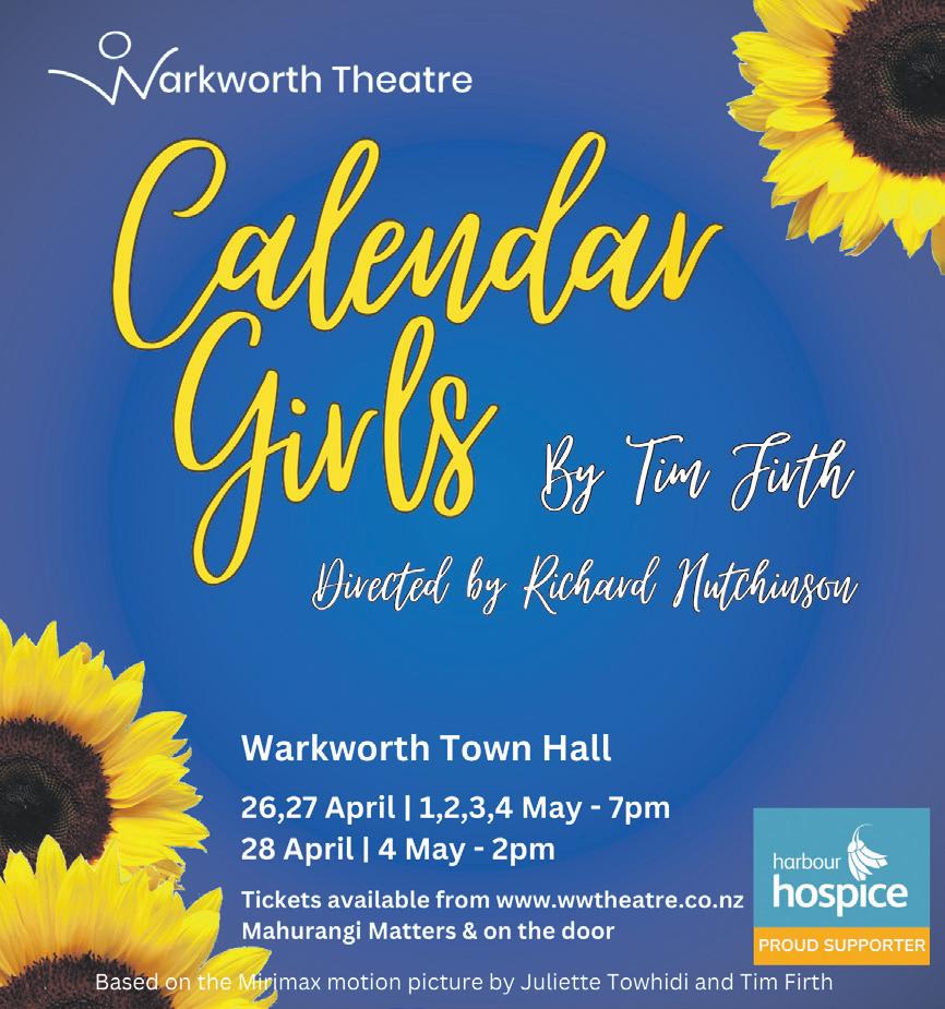 26-28, 1-4 May Calendar Girls, Warkworth Town Hall, 7pm. April 28, 2pm only. May 4, 2pm & 7pm. Production by Warkworth Theatre Group. Adults $25, seniors $20, students $2. Tickets from the Mahurangi Matters office, on the door or https://wwtheatre.co.nz/